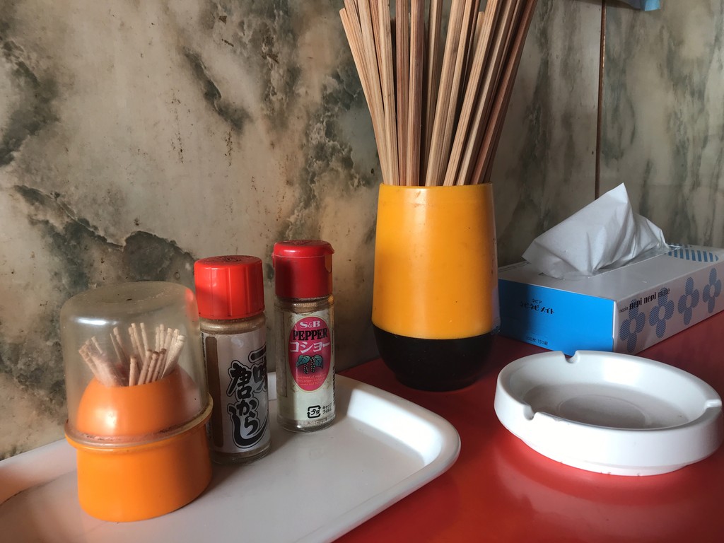 テーブルに置かれた一味にも歴史を感じ、ラベルの赤色はどこに行ったのか白くなっています。