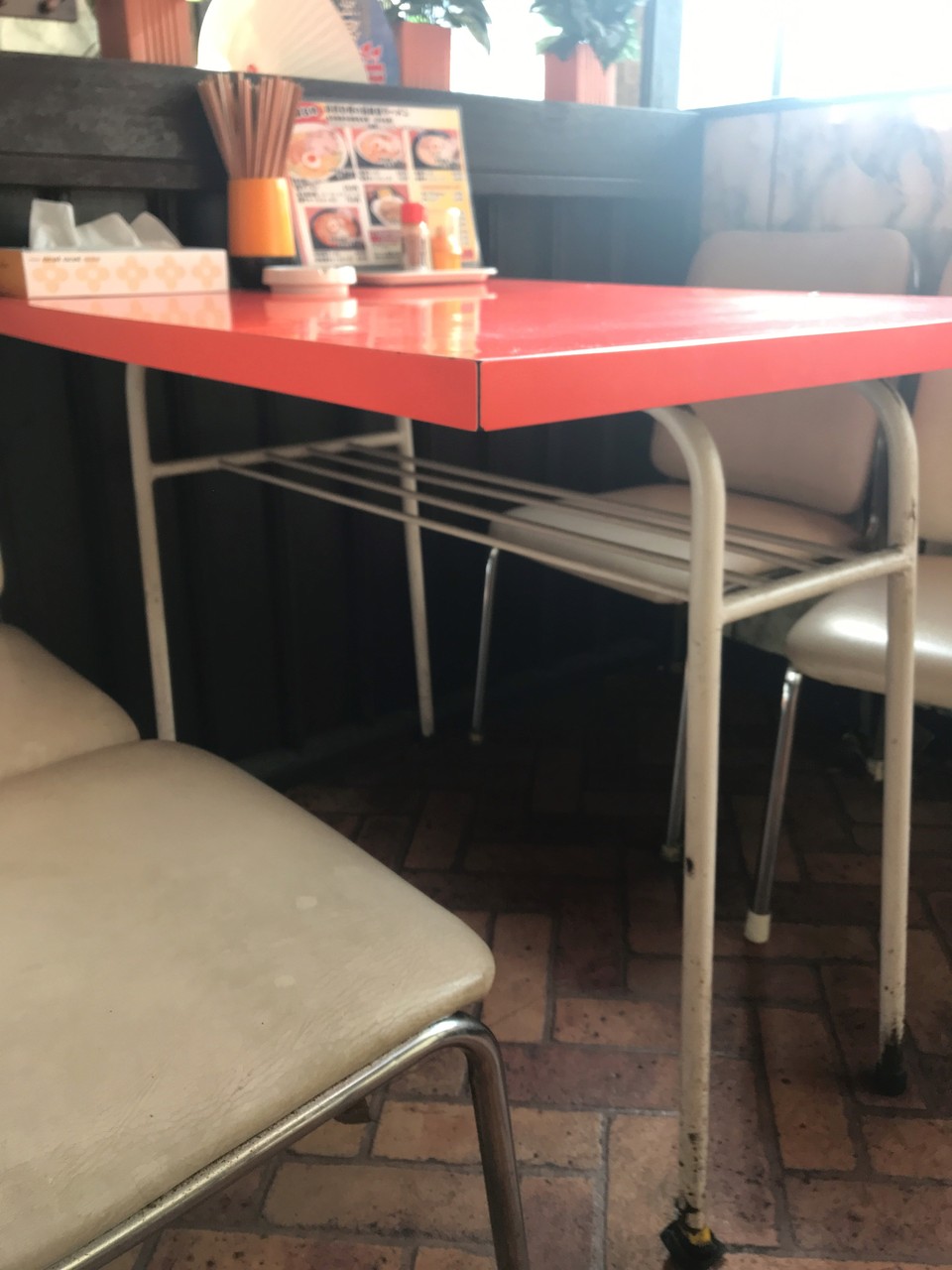 店内のテーブルは、やけに脚が中央寄りでした。