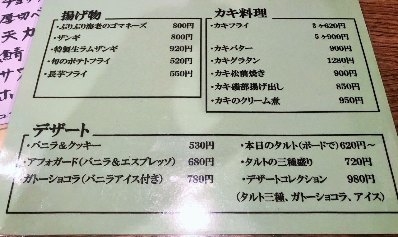 揚げ物、カキ料理、デザートのメニューです。