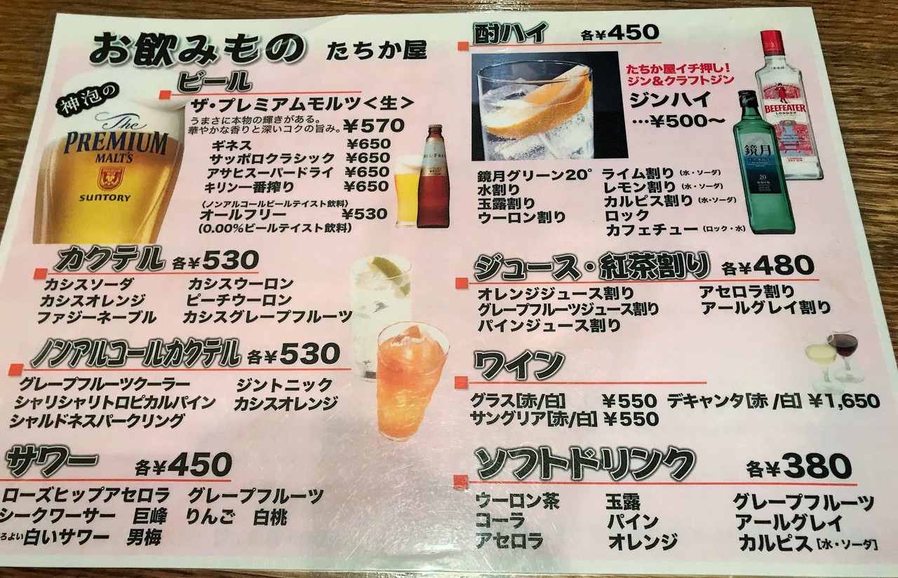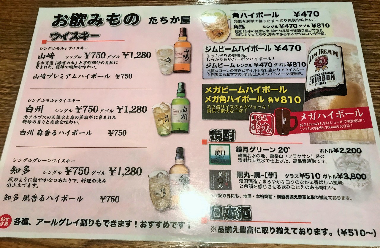 こちらはウイスキーや焼酎の飲み物メニューです。