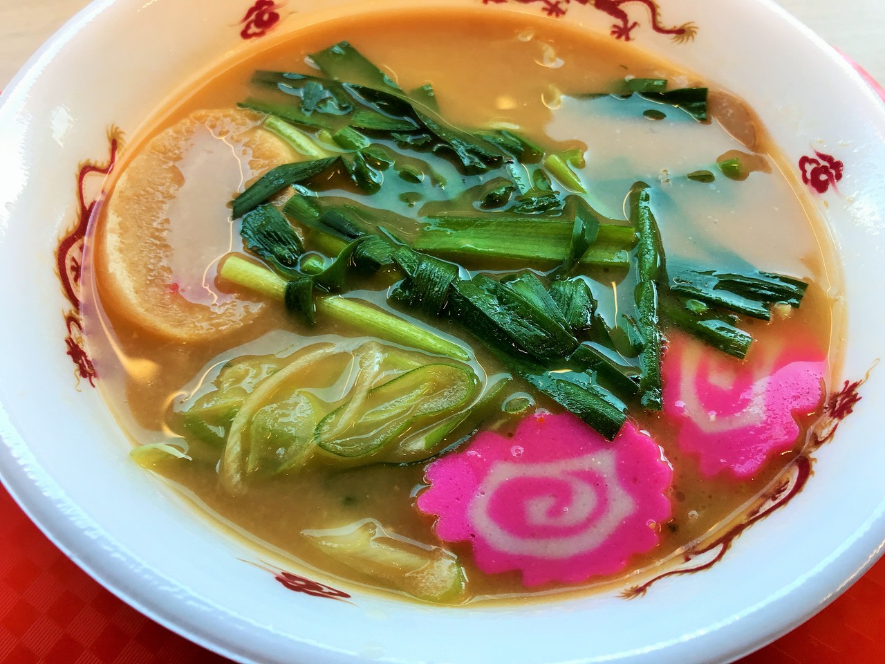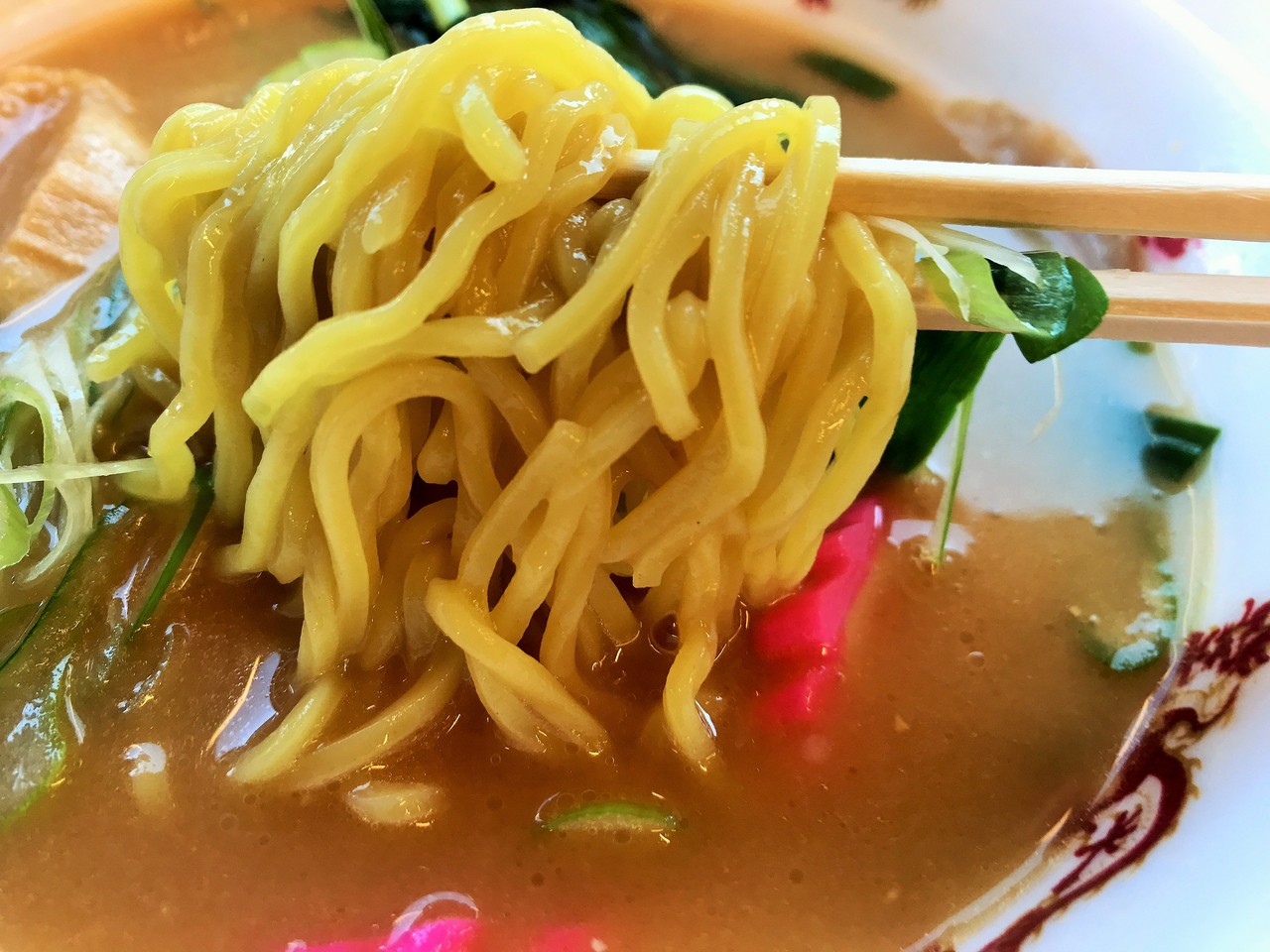 味噌ラーメンなのに、トッピングに昔ながらの正油ラーメンの如く、麩とナルトが入っています。