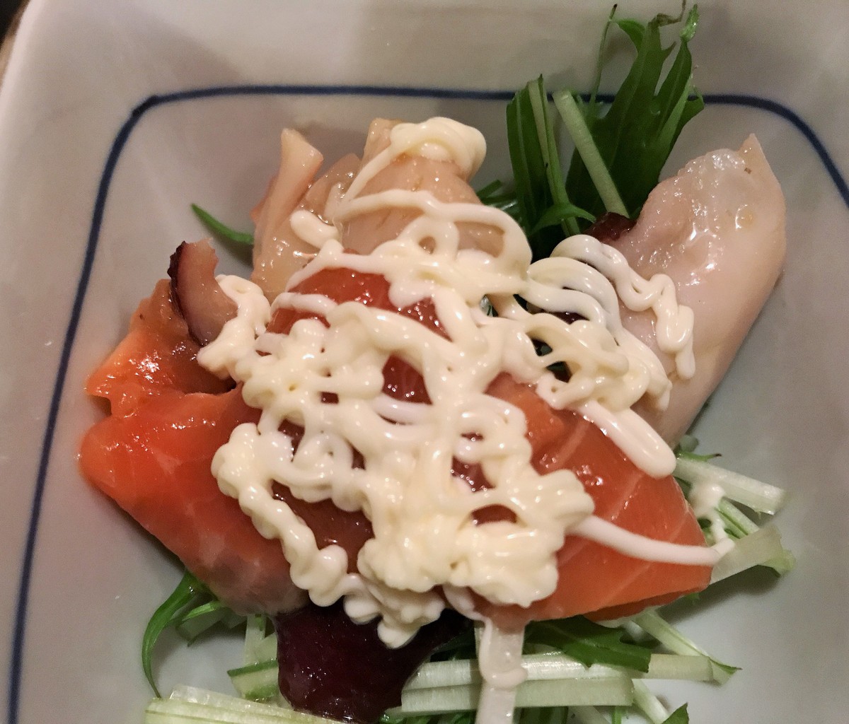 この日のお通しは、たこ・サーモンのカルパッチョ。