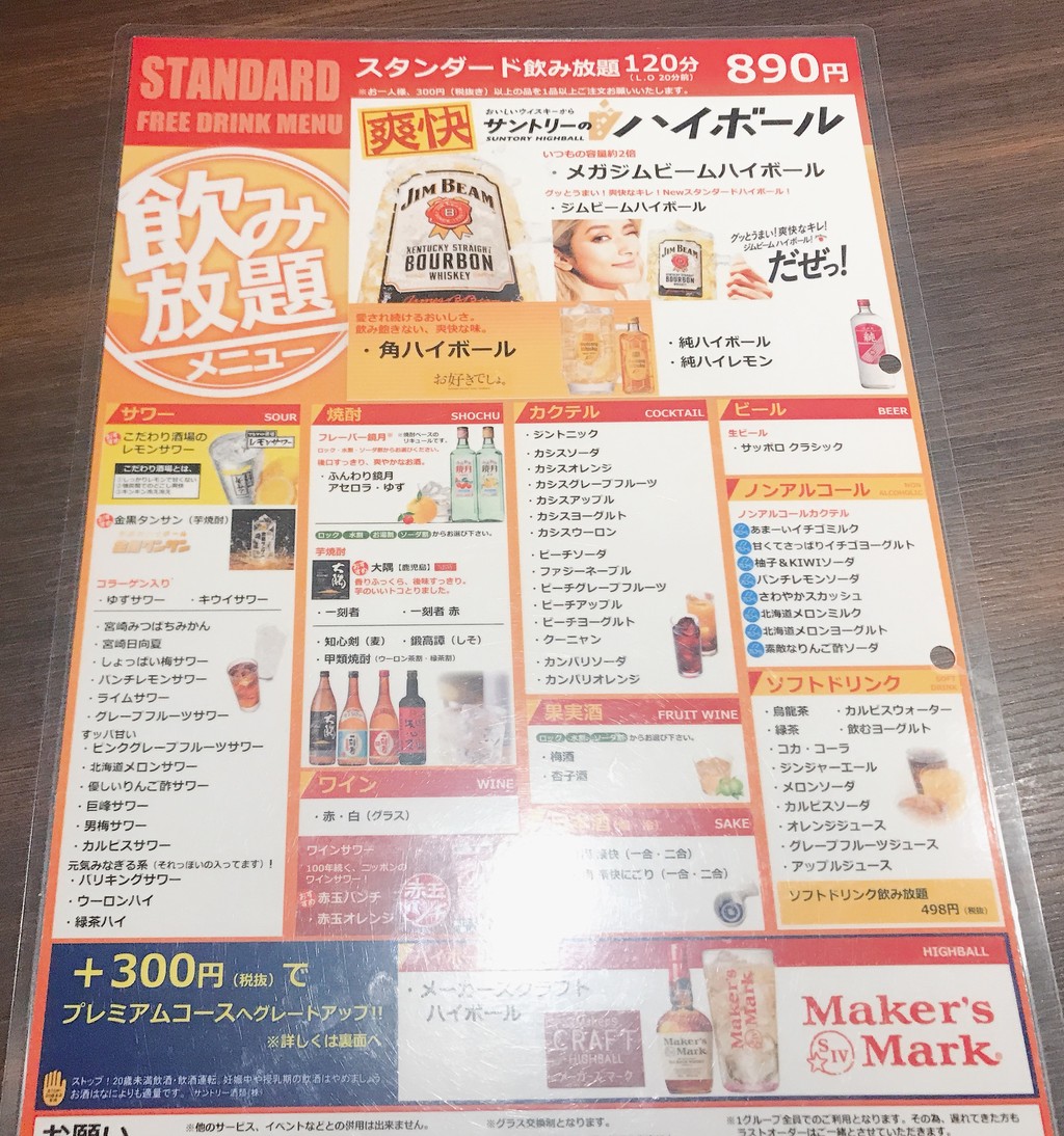 上の画像はスタンダード飲み放題コースです。
