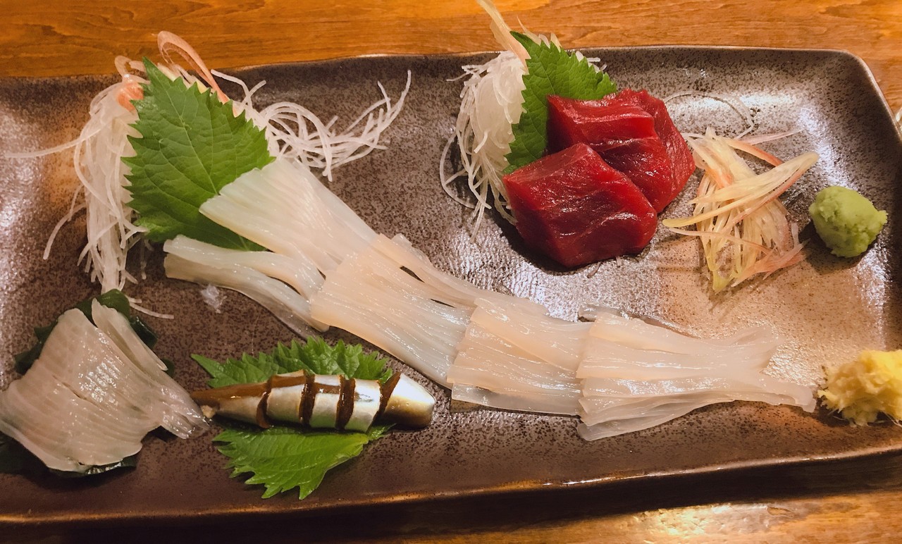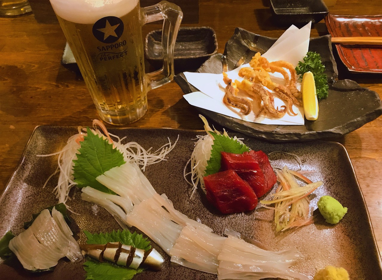 飲み物の他に、近海産本マグロ赤身、真イカの刺身、げそ唐揚げのセット。
