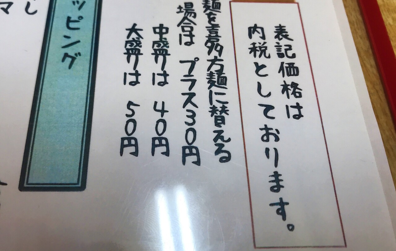 以前はメニューが税抜き表示でしたが、税込み表示になりました。
