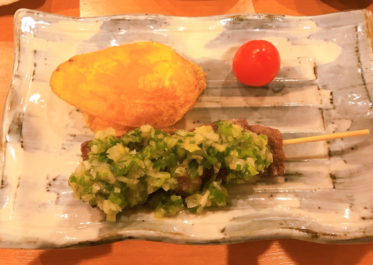続いては、ネギまみれの牛串及び自家製ポテチ。