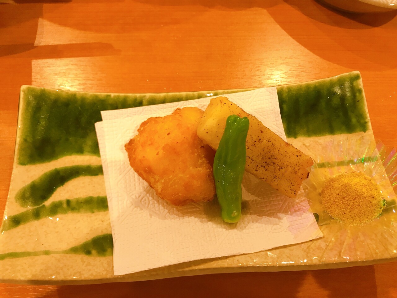料理の説明が無かったので不明ですが、イモとかまぼこを揚げたようなものでした。