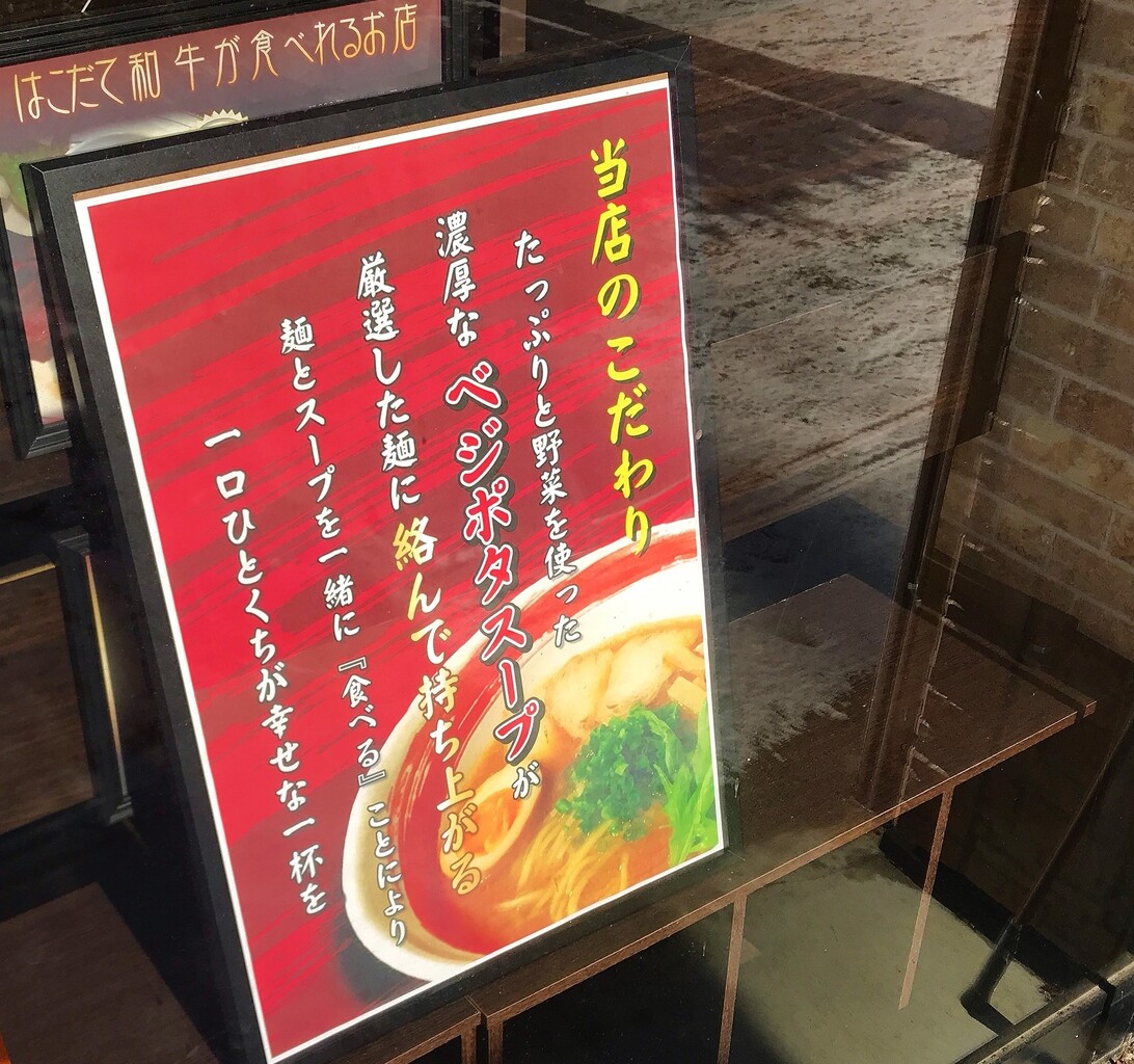 濃厚なベジポタスープのラーメンがこだわりと看板に記載。