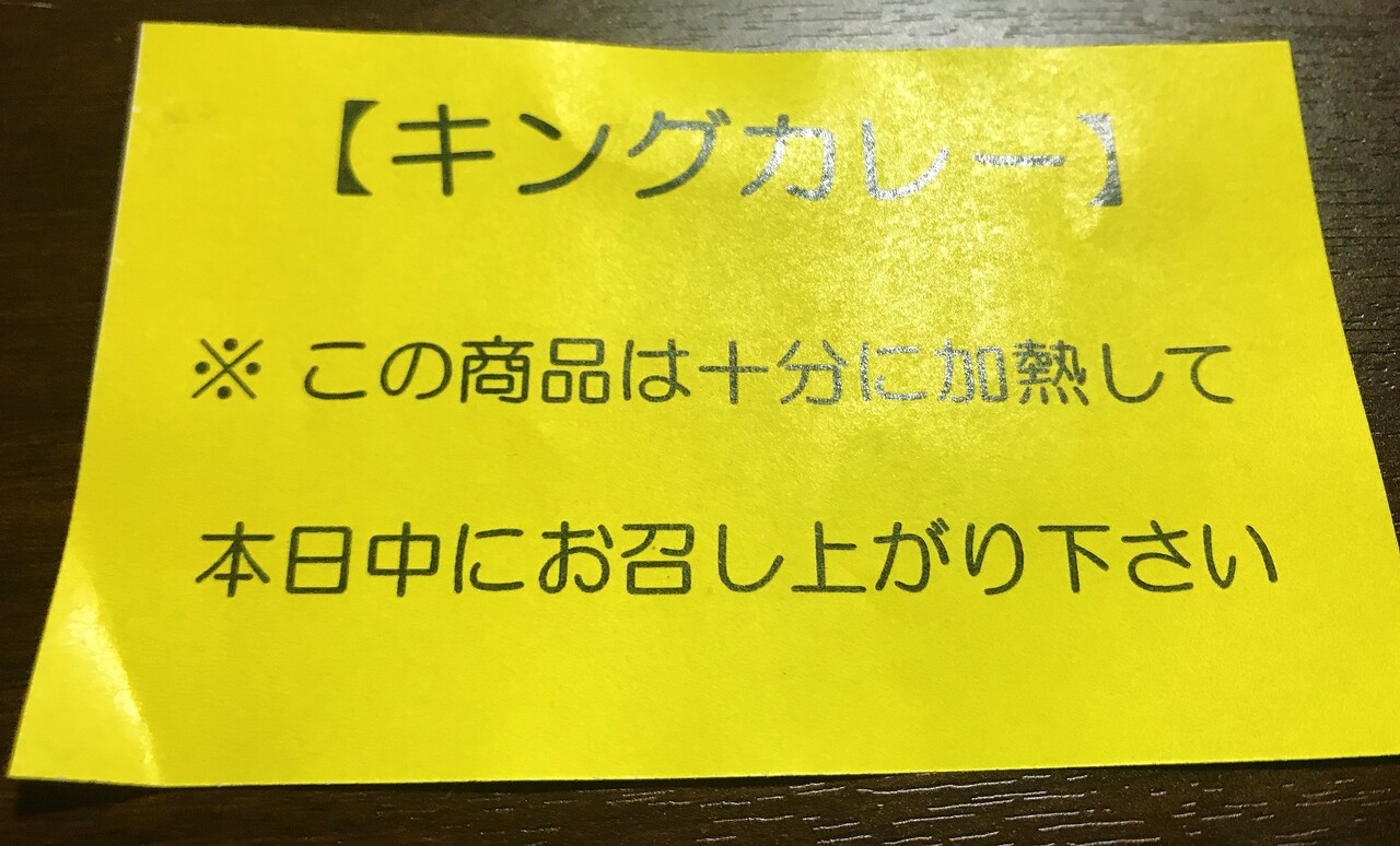 持ち帰りのカレーは、加熱し本日中にお召し上がりくださいの表記です。