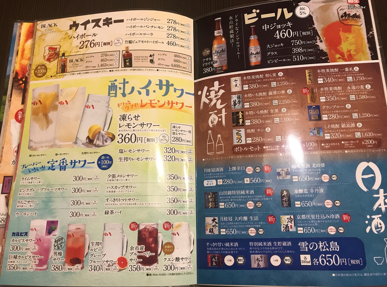 アルコールメニュー。