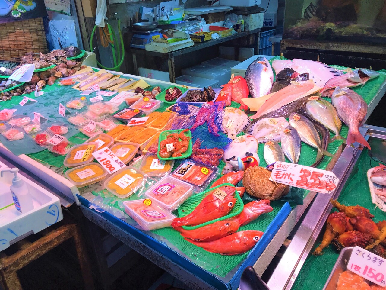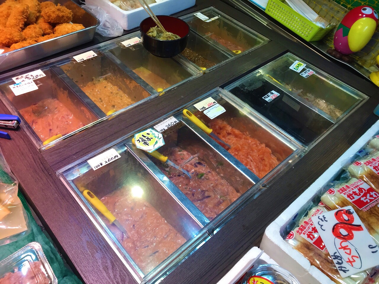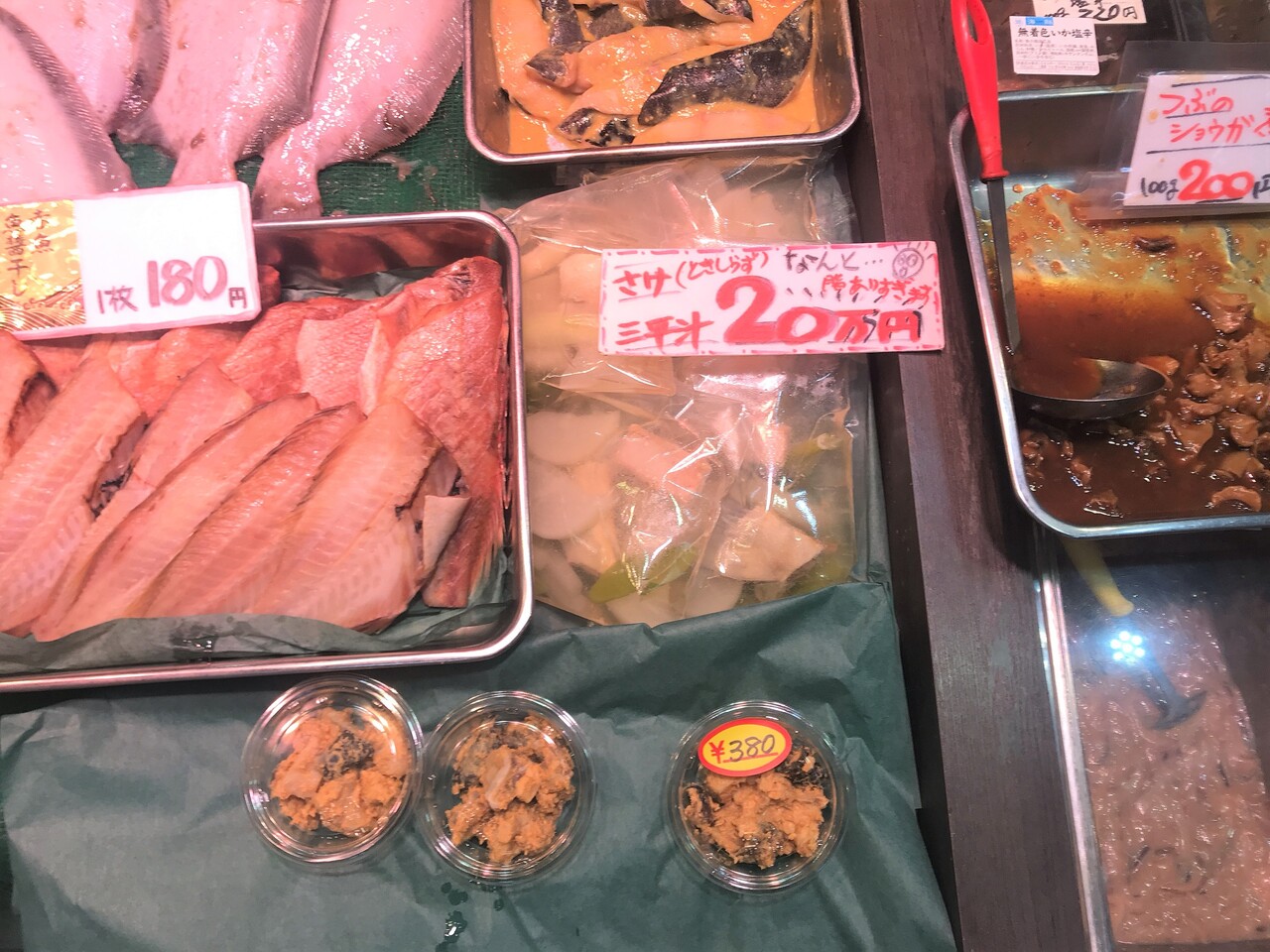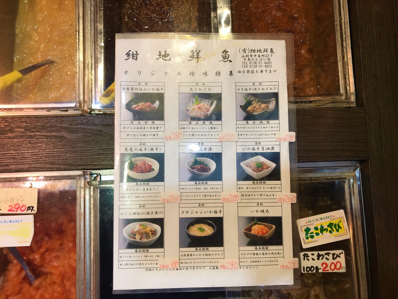 紺地鮮魚は、塩辛各種が並ぶのも魅力。