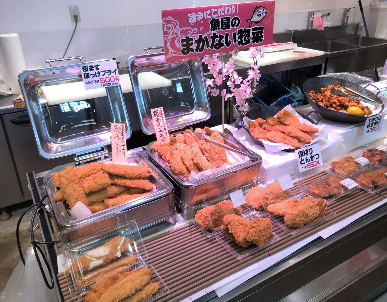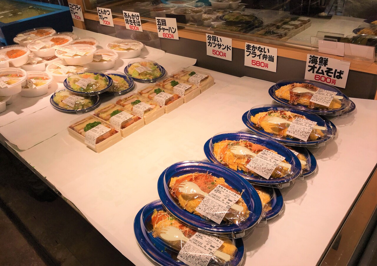 海鮮オムそば等、テイクアウト弁当が並びます。