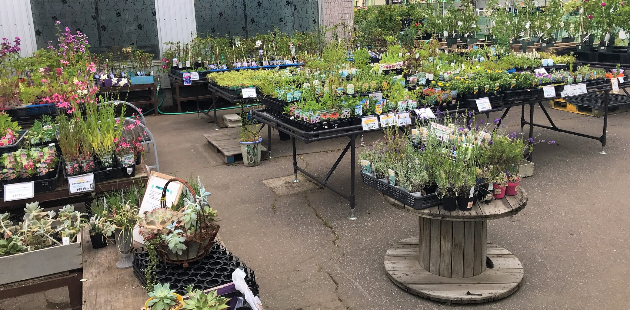 プロが使う道具だけではなく、ガーデニング用品も種類豊富に並ぶ店のようです。