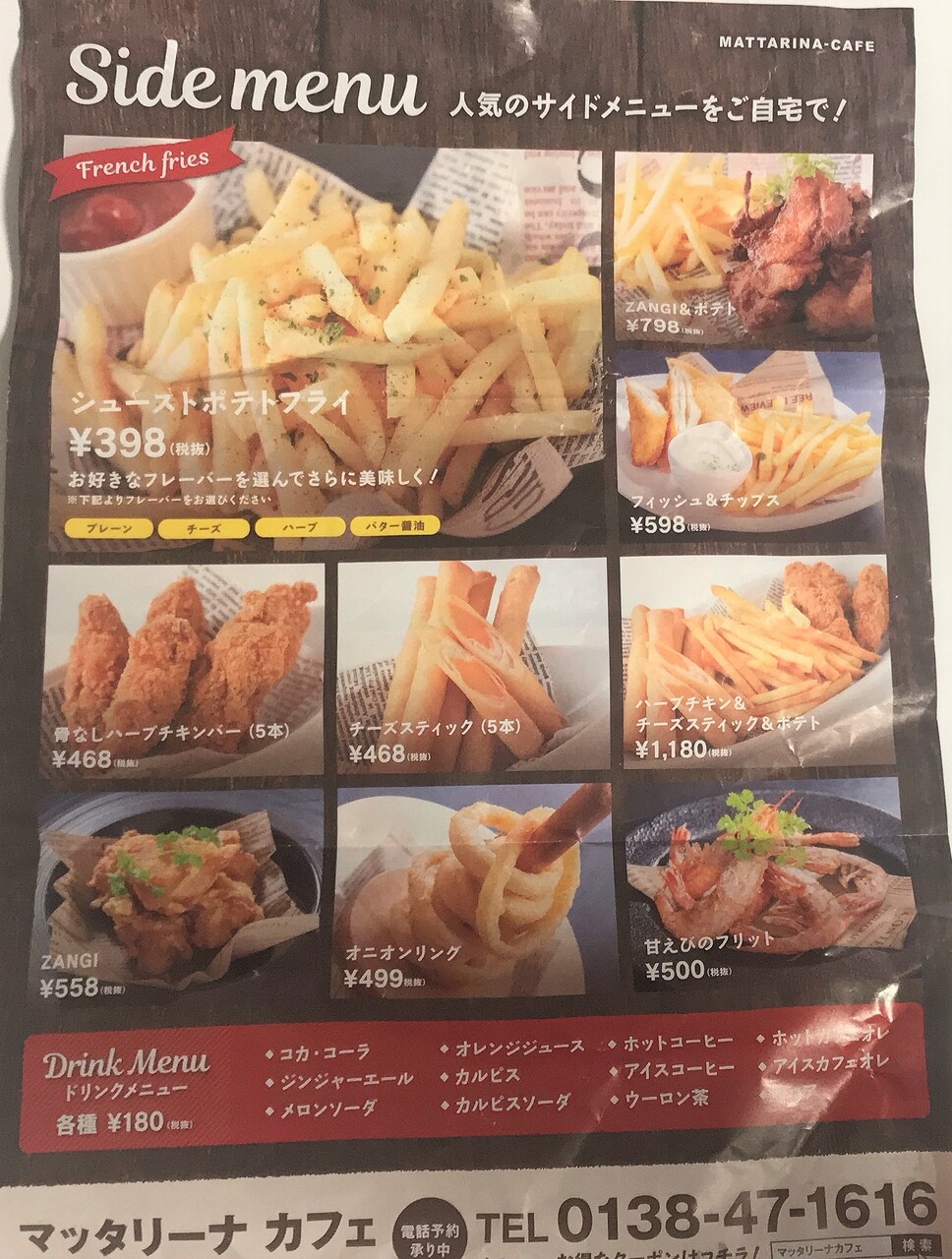 こちらは、持ち帰りのサイドメニューとドリンクメニュー。