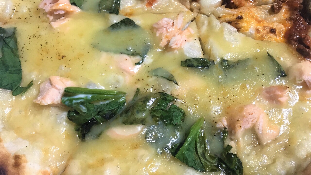 「ピザ」って10回言った後に、ひじを見せられて「ヒザ」と言ってはいけないとわかっているのに、「ヒザ」と言いたいほどに、クリーミーなピザ。