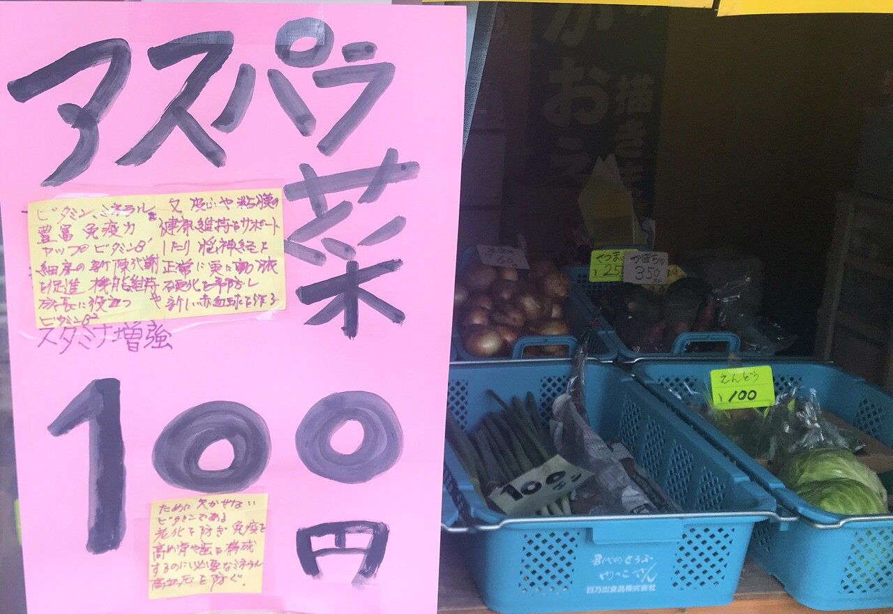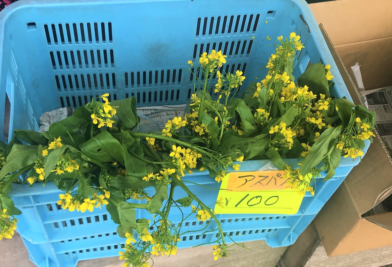 店の前に花が並んでいると思いきや、アスパラ菜という野菜でした。