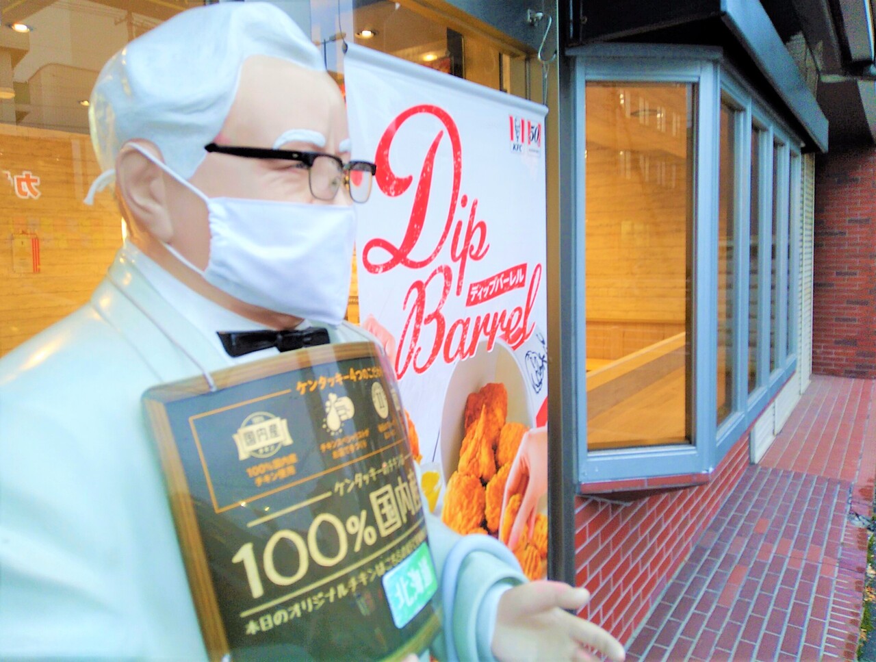 ハーランド・デーヴィッド・サンダース(カーネル・サンダース)像もマスクを着用。