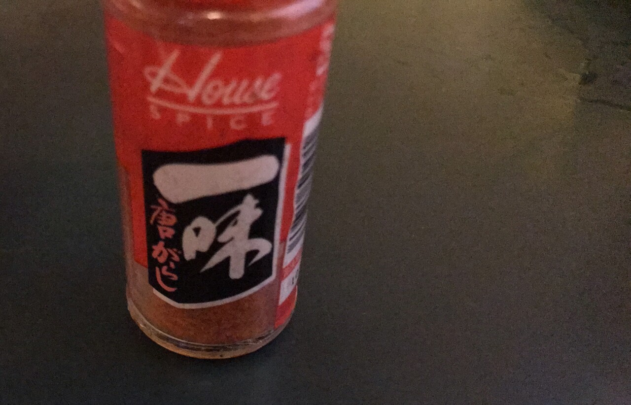 何気なく卓上調味料に目をやると、懐かしいラベルのハウスの一味唐辛子。