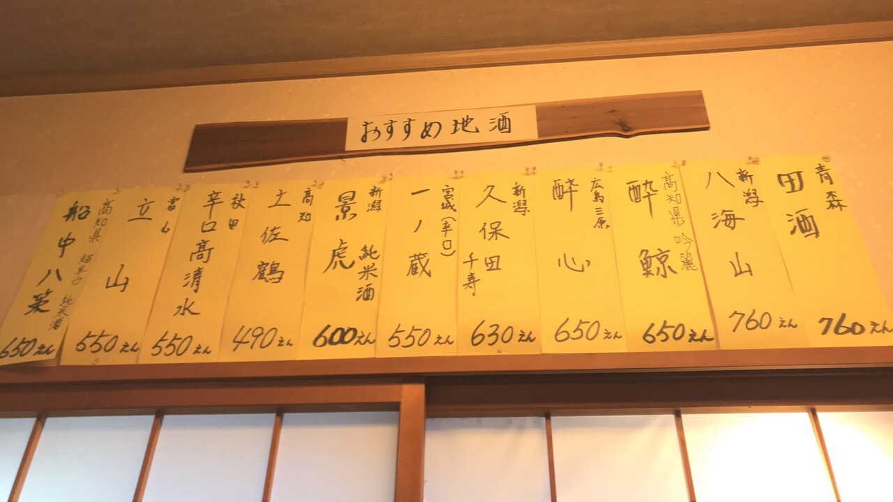 おすすめ地酒メニューは、窓の上に張り出されております。