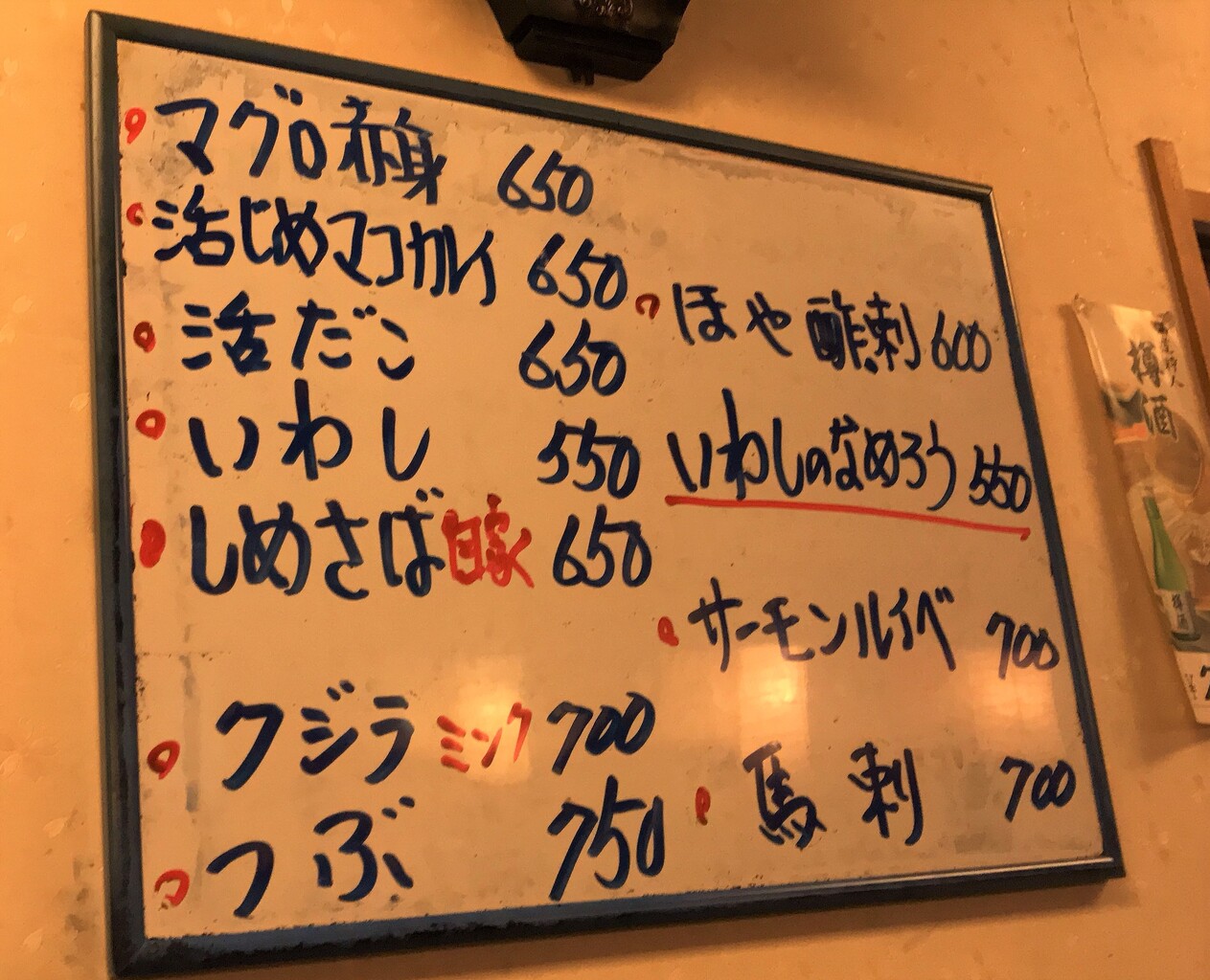 本日のおすすめが、小上がり席の横にありました。