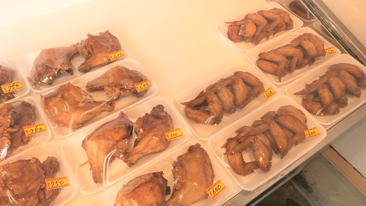 手羽先の他、並ぶ惣菜どれもおいしいですが、おすすめは鶏もも肉の1枚揚げ。