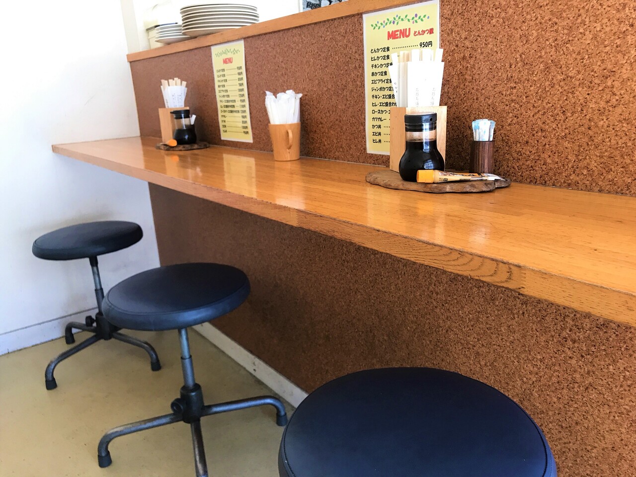 カウンターの後ろは持ち帰りメニューを待つ椅子。