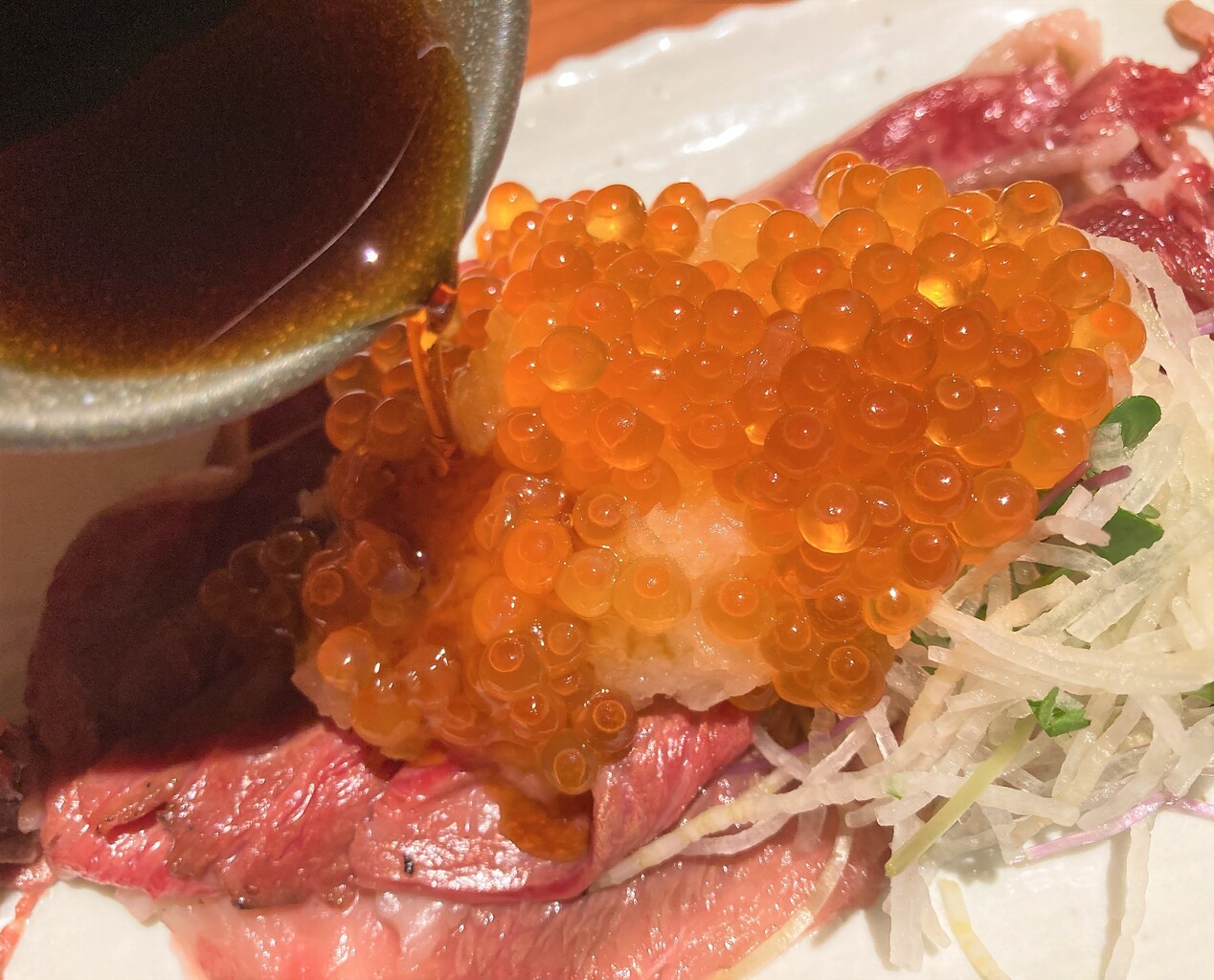 牛とろ肉の炙りぶっかけいくらおろし。