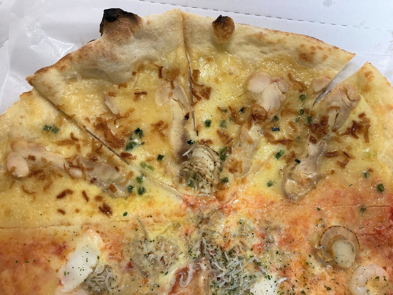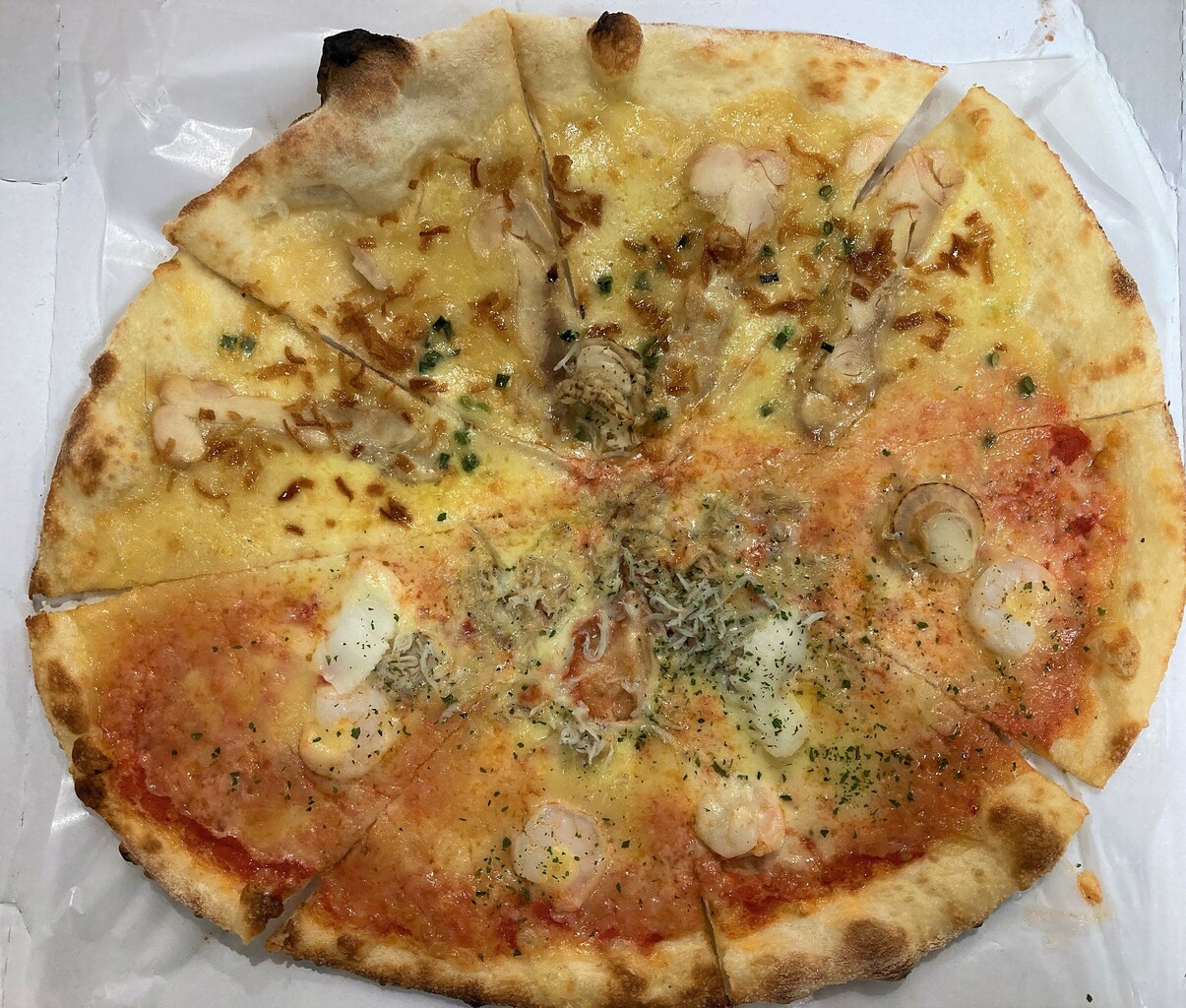 うす焼きタイプのピザのハーフ&ハーフ 1350円。