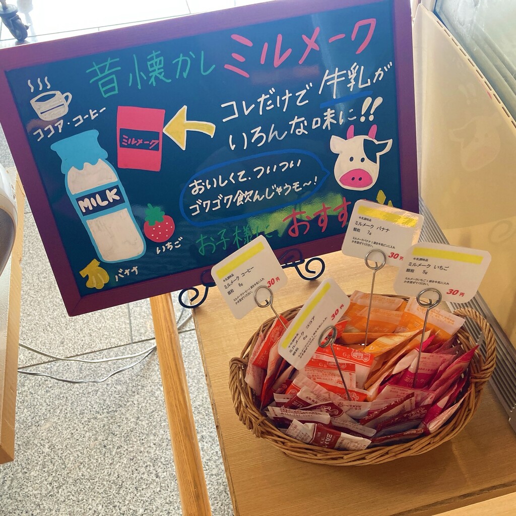 牛乳だけではなく、ミルメークも30円で売られていたのが面白かったですね。