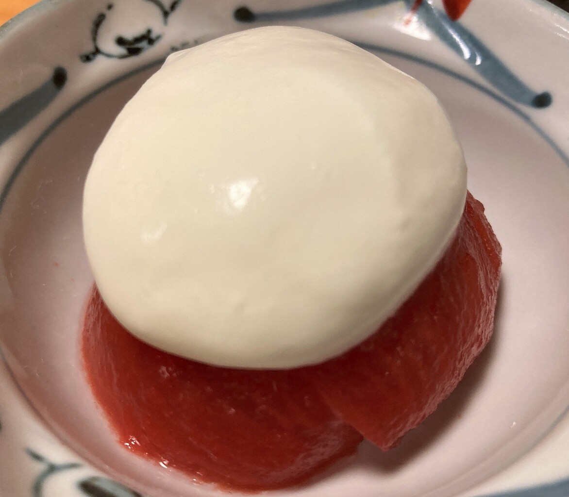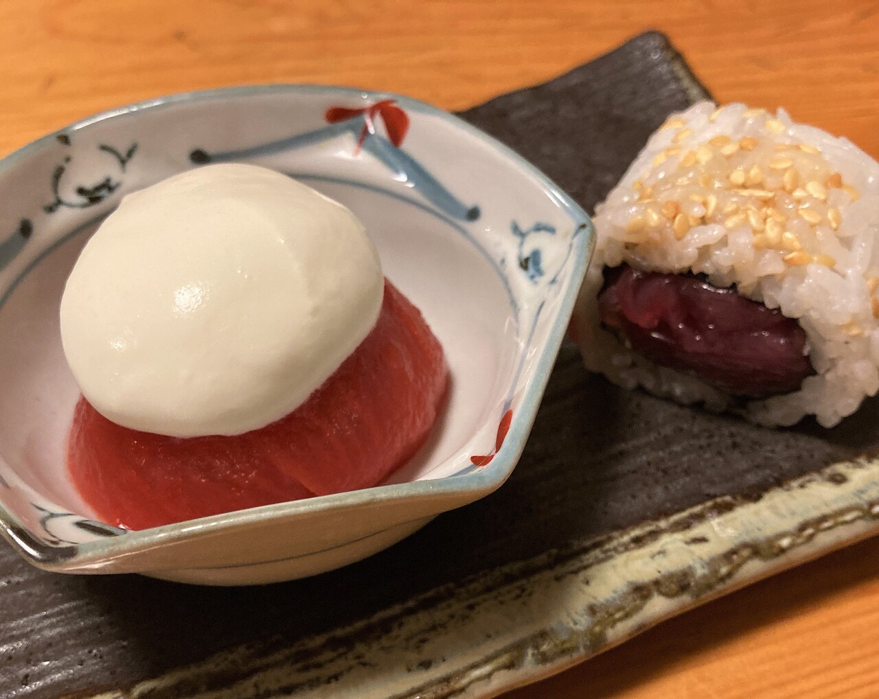 お通しは鉄火巻きと、トマトの塩クリームのせでした。