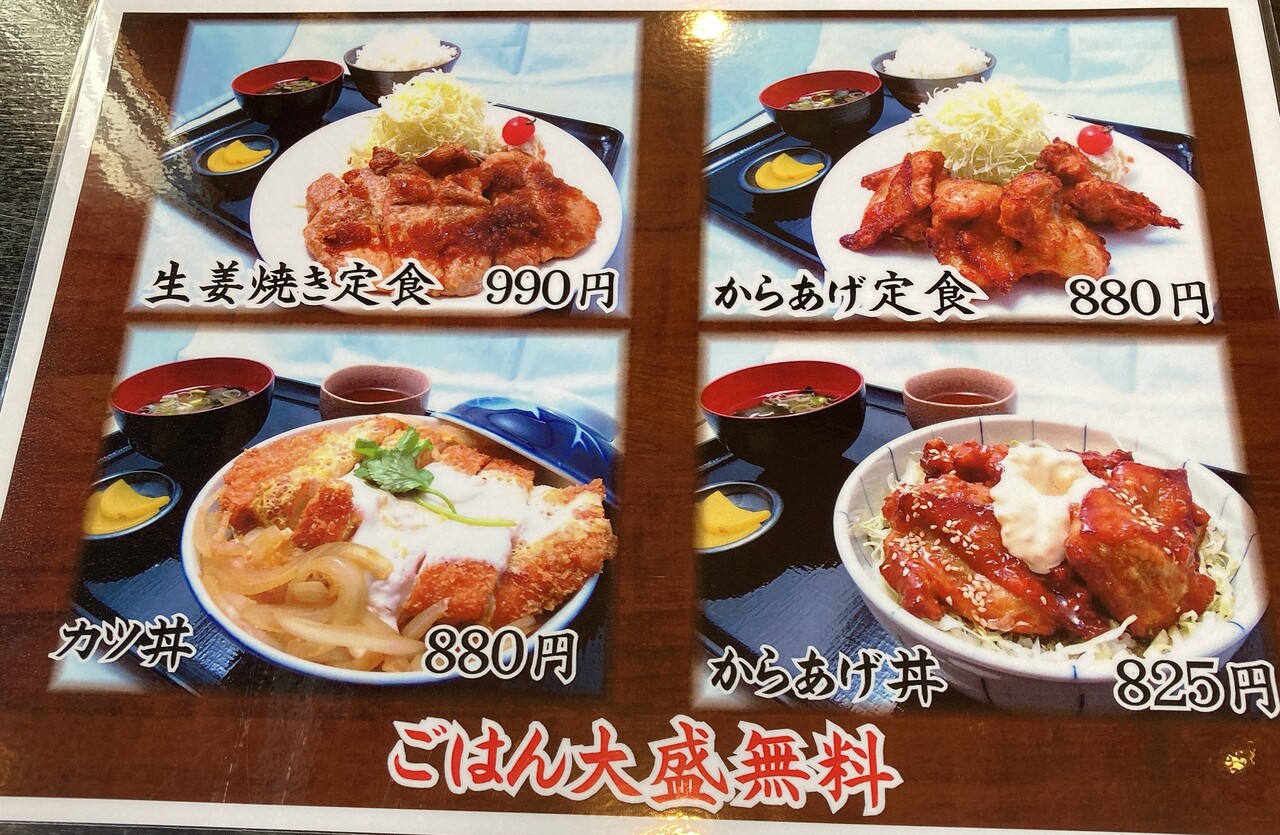 定食、カツ丼、からあげ丼は、ご飯大盛無料のようです。