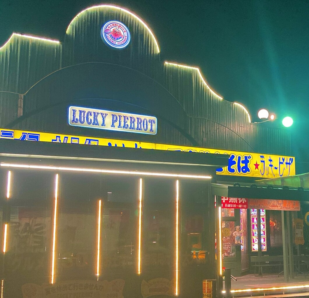 暗闇の中で輝く、ラッキーピエロ 森町 赤井川店。