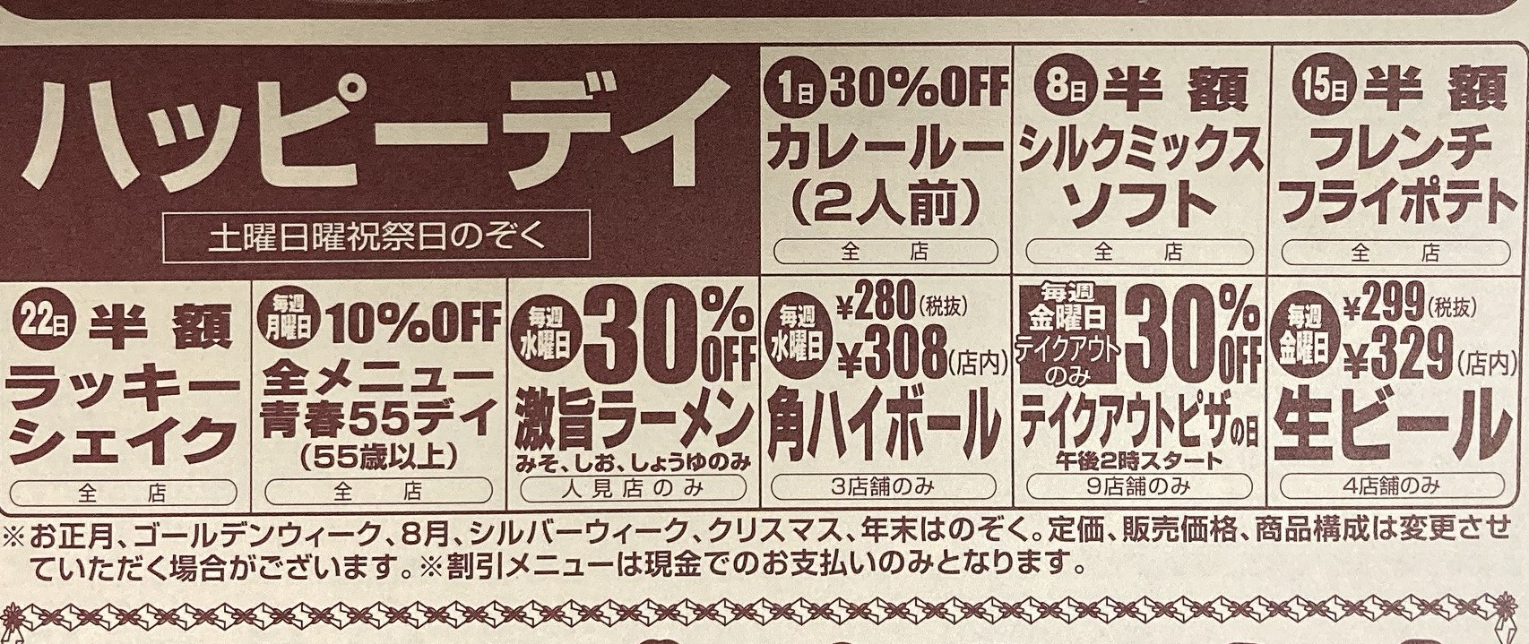 曜日や日によって、色々な割引があります。