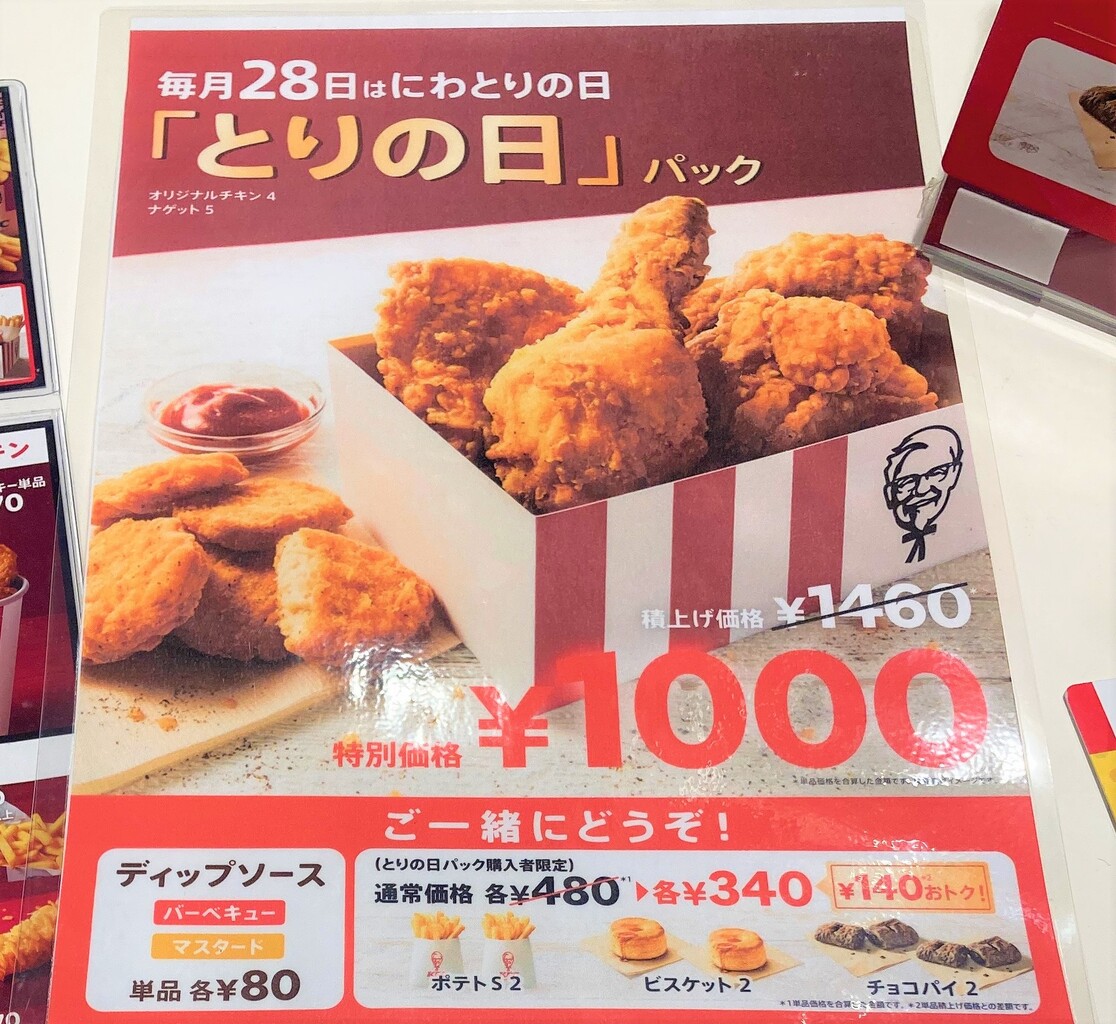 ケンタッキーでは毎月28日にとりの日パックを販売している。