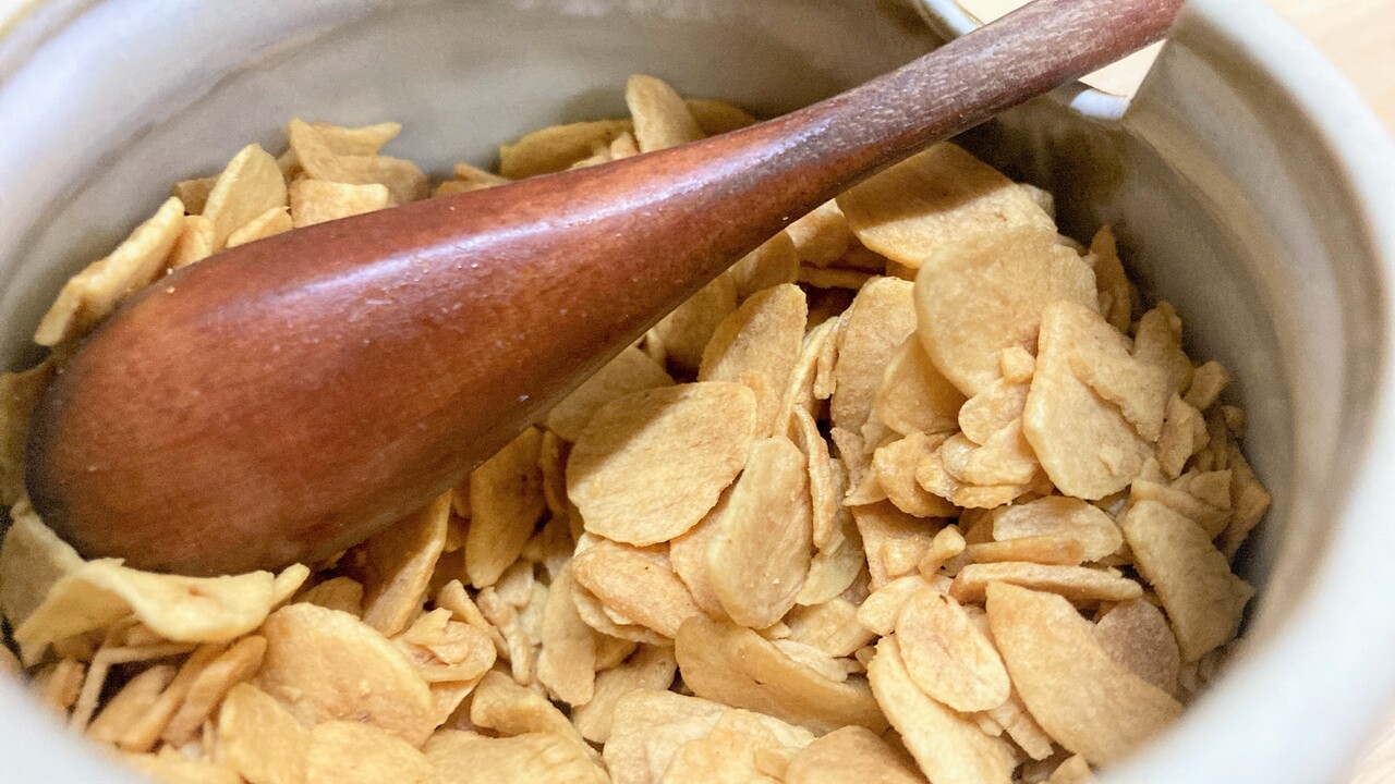 いつもの、ガーリックチップを準備してと。