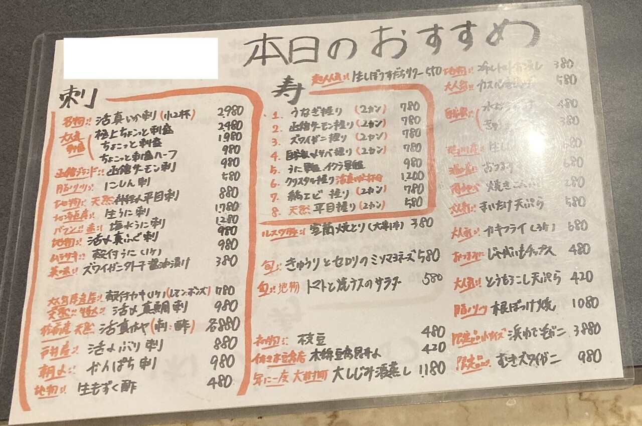 この日は、活真いか刺(小2杯)で2980円だった。