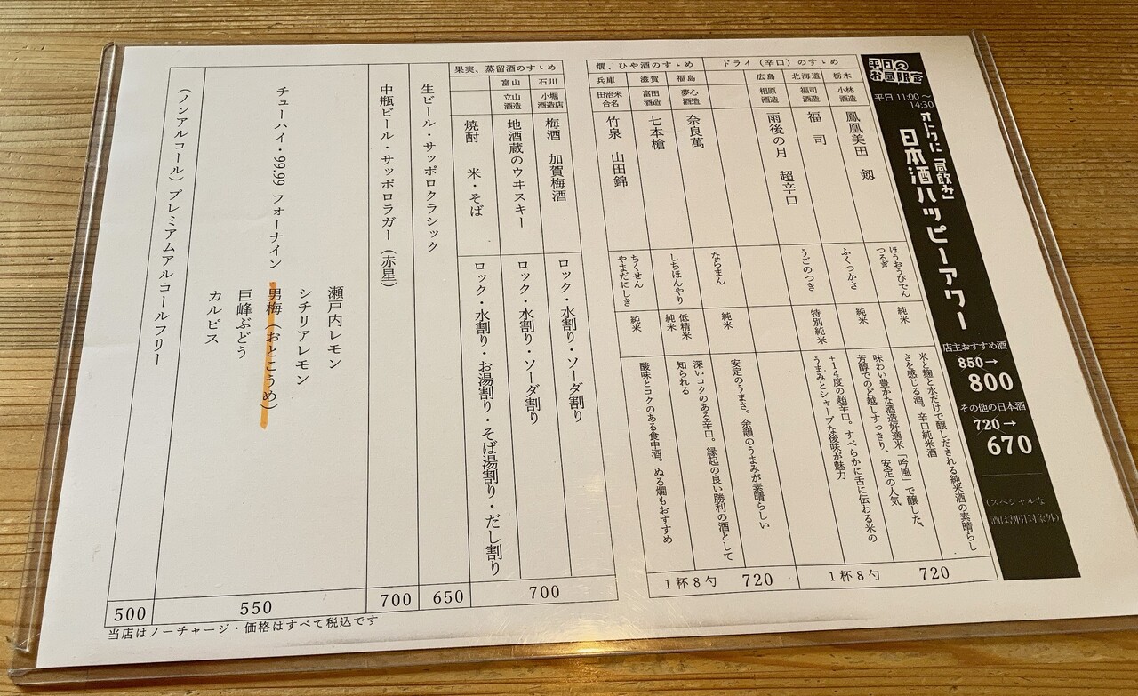 日本酒ハッピーアワーのメニュー。