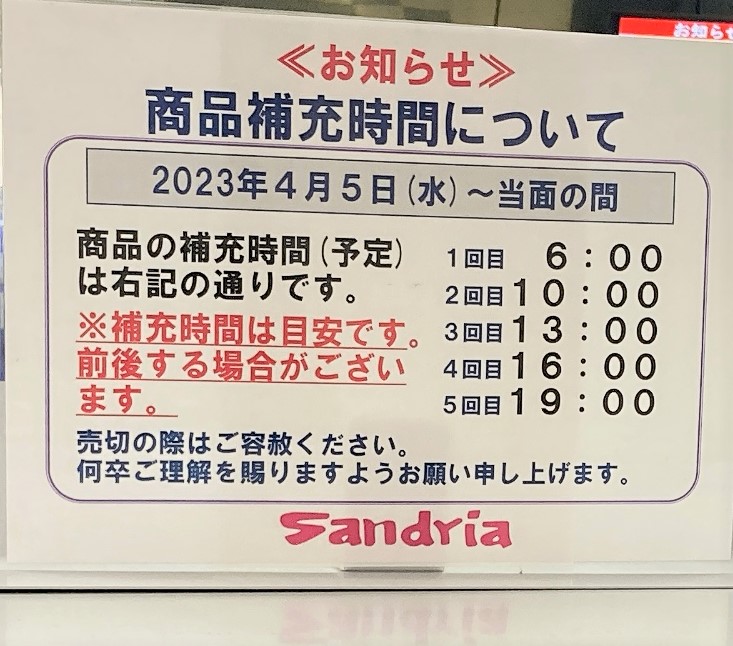 上の画像は、商品補充時間のお知らせ。