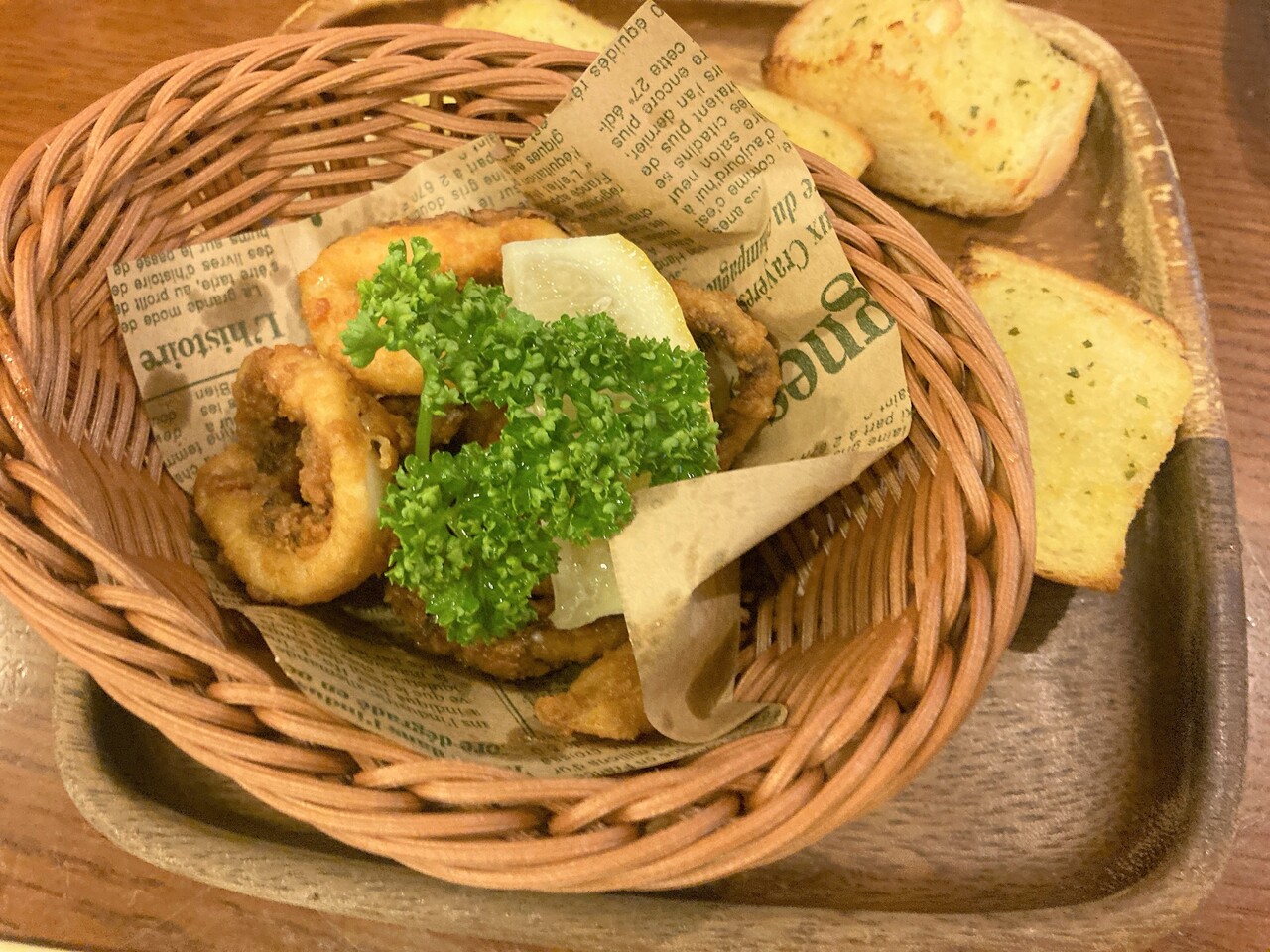 ガーリックトーストと、イカの唐揚げ。