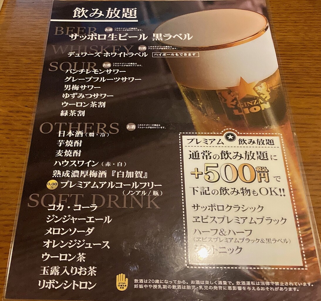 +500円でサッポロクラシック等も飲み放題になる。