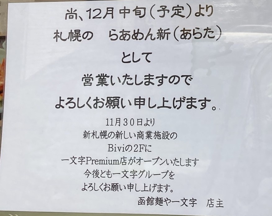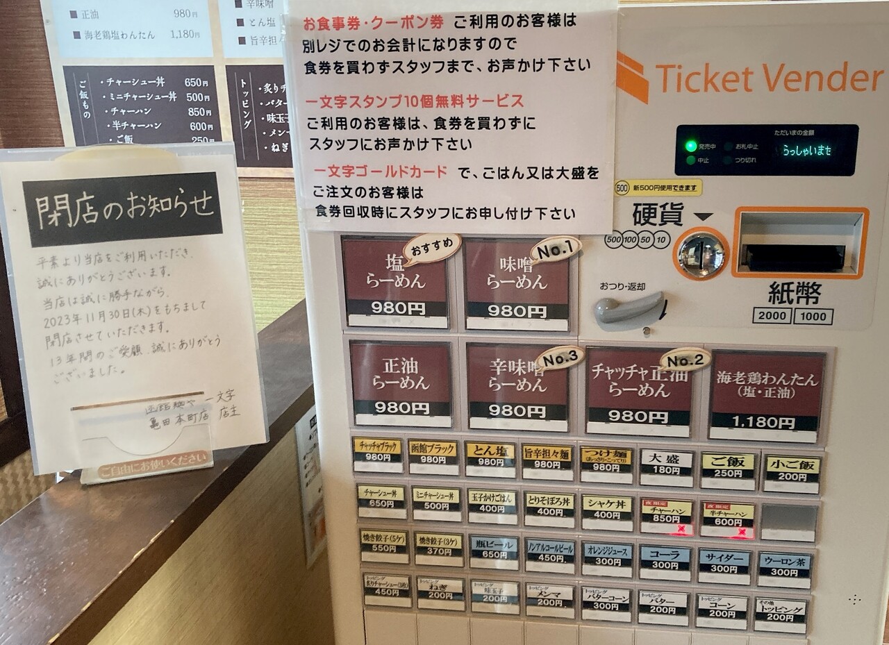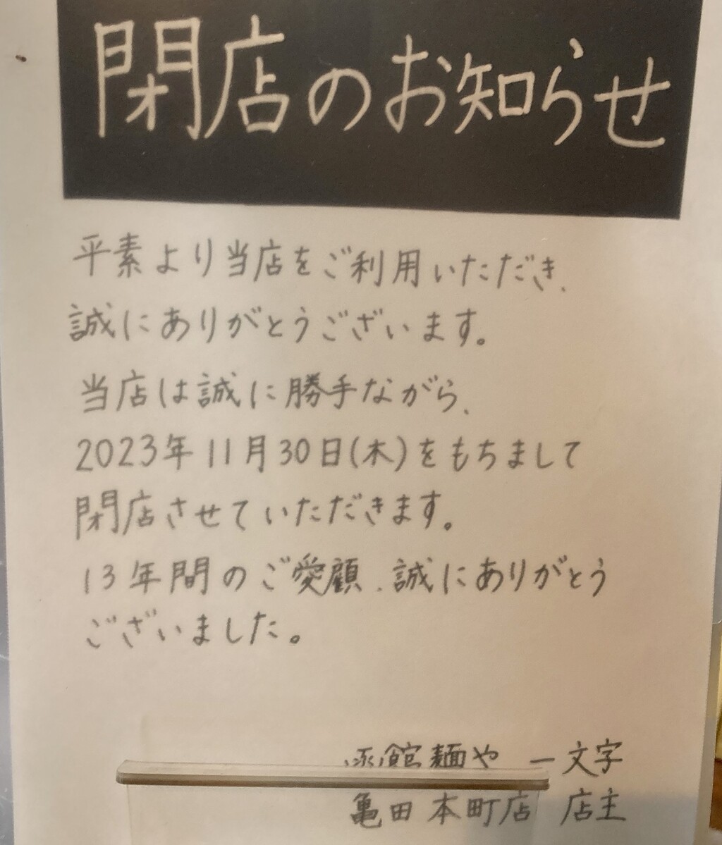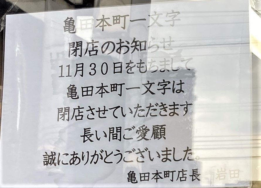 同時に、一文字 亀田本町店閉店のお知らせが。