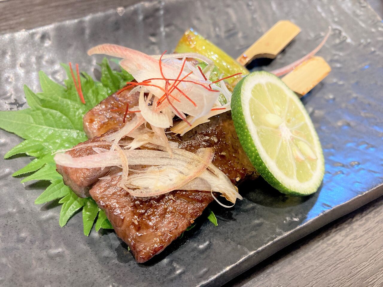 ■強肴 道産黒毛和牛とアスパラ串山椒焼