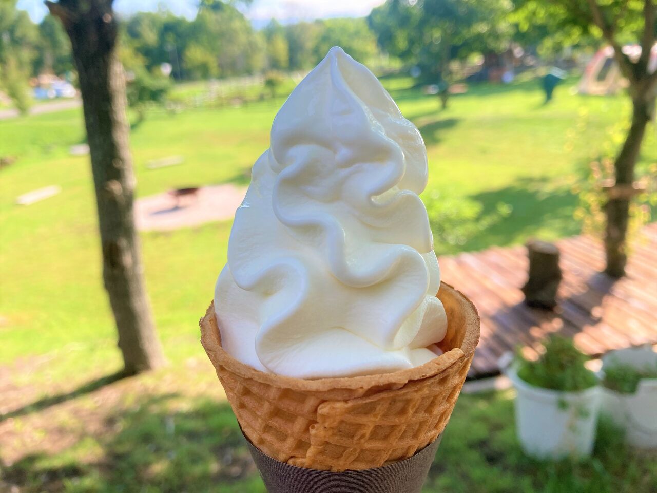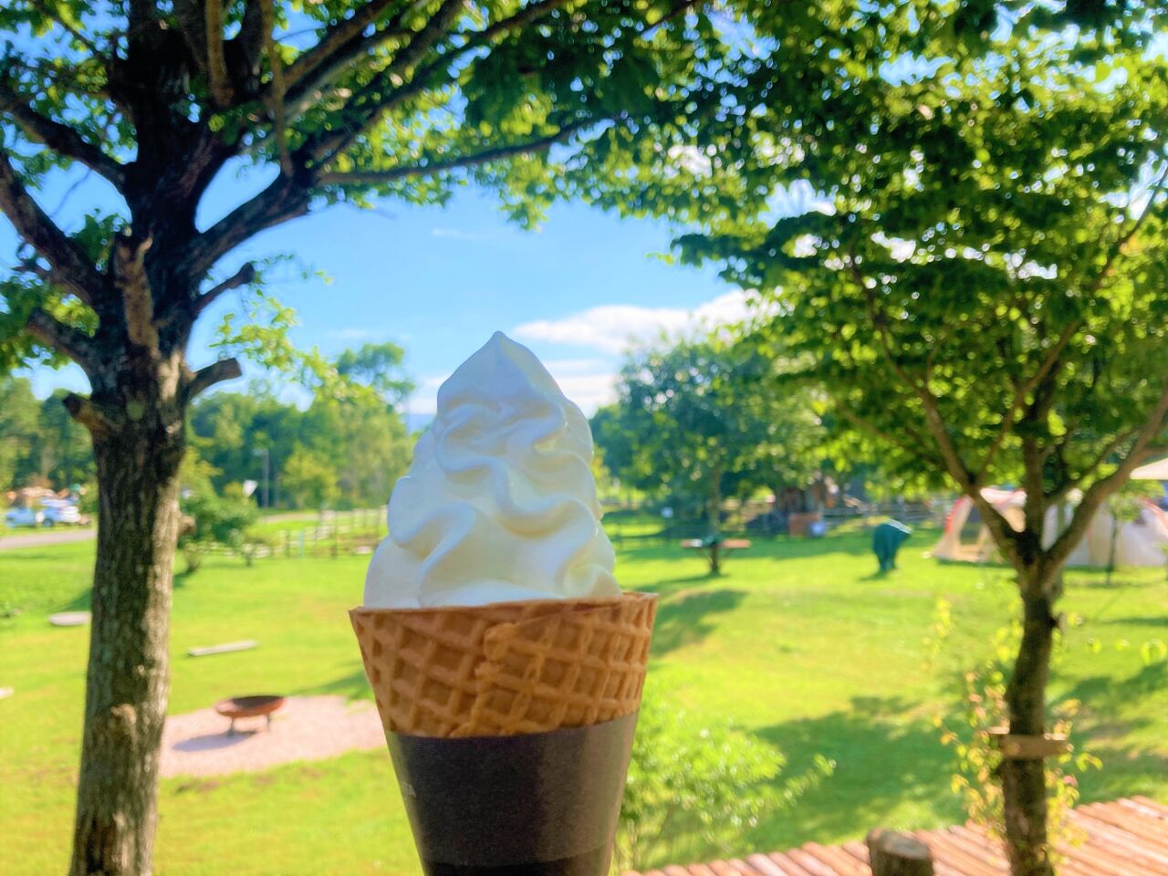 キャンプ場で食べるソフトクリームは最高だな。