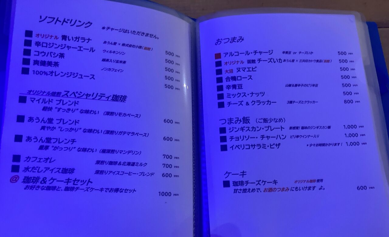 ソフトドリンクや、おつまみメニュー。