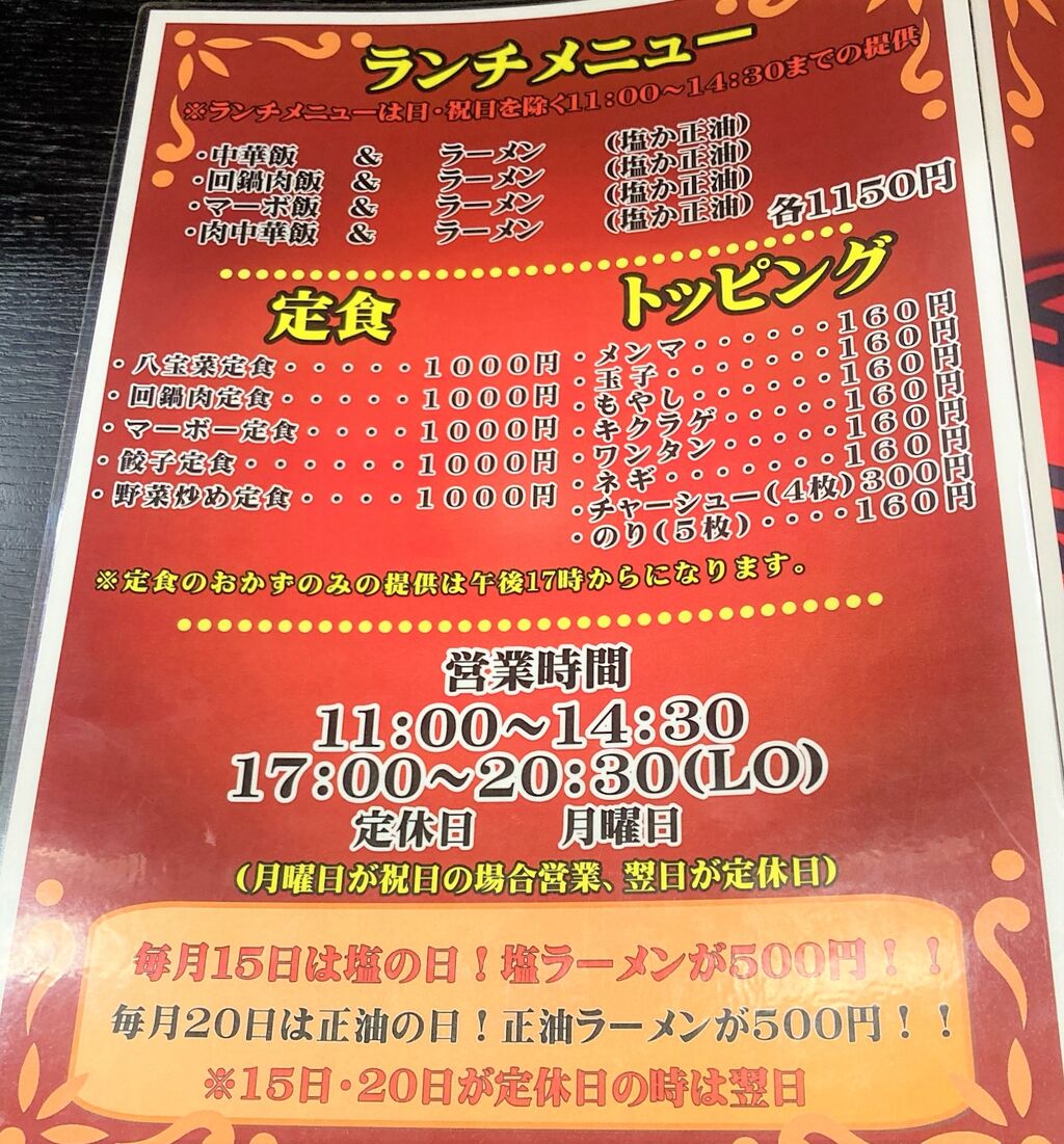 ランチメニュー、定食、トッピングのメニュー。