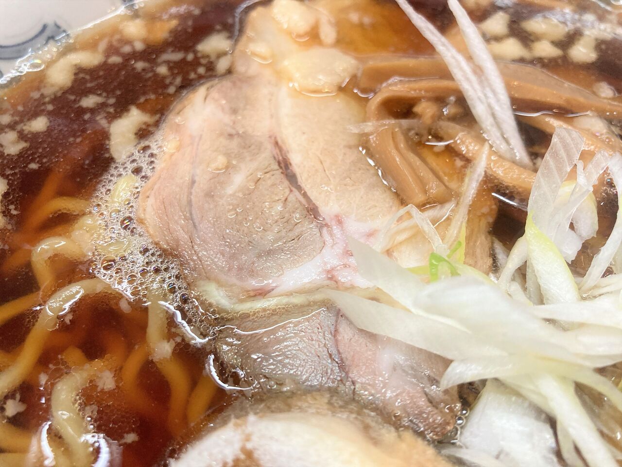 チャーシュー、麩、メンマ、ネギがのって。