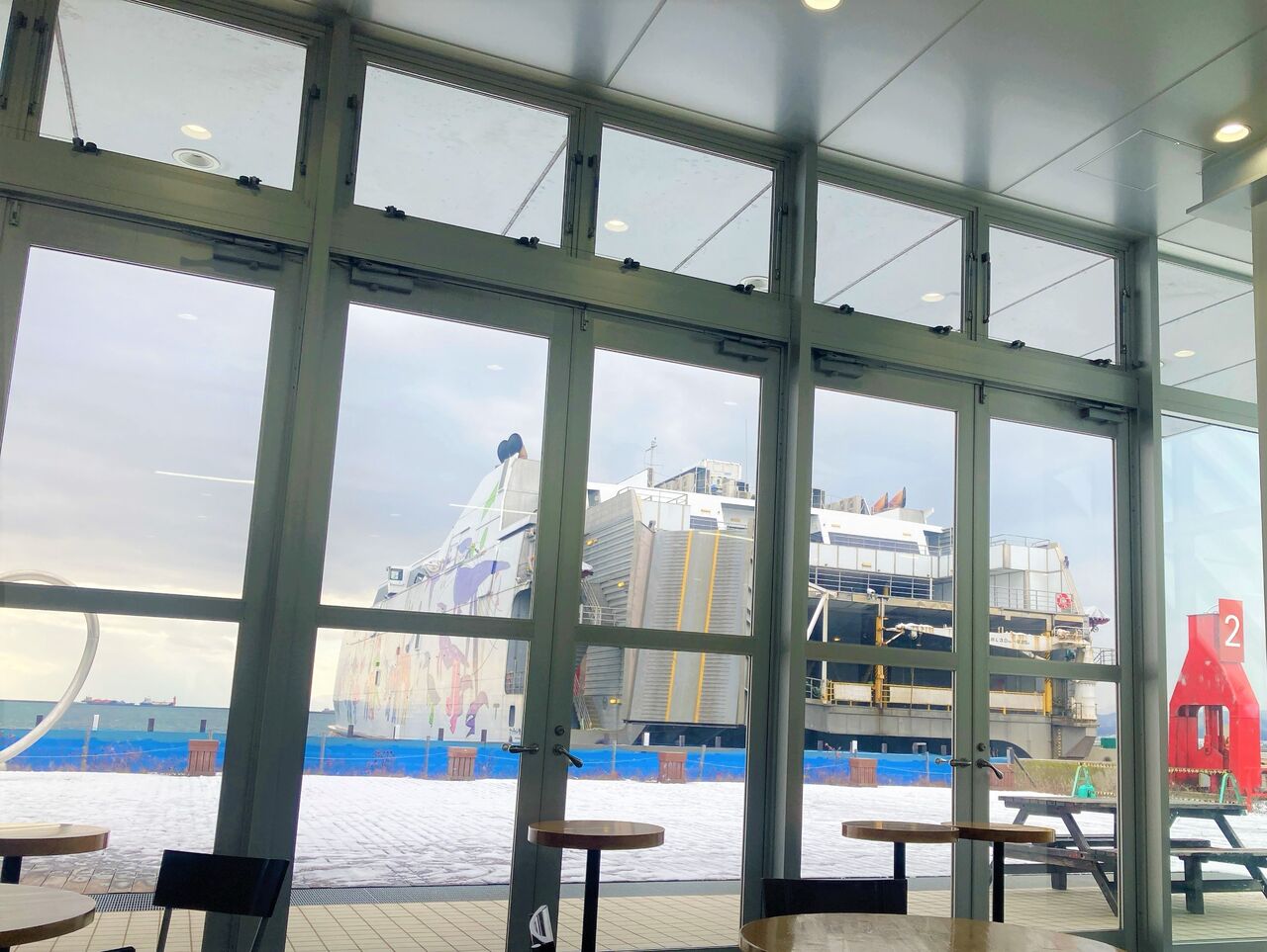 窓の外にフェリーが見えるが、ずっと見ていられるぜ。