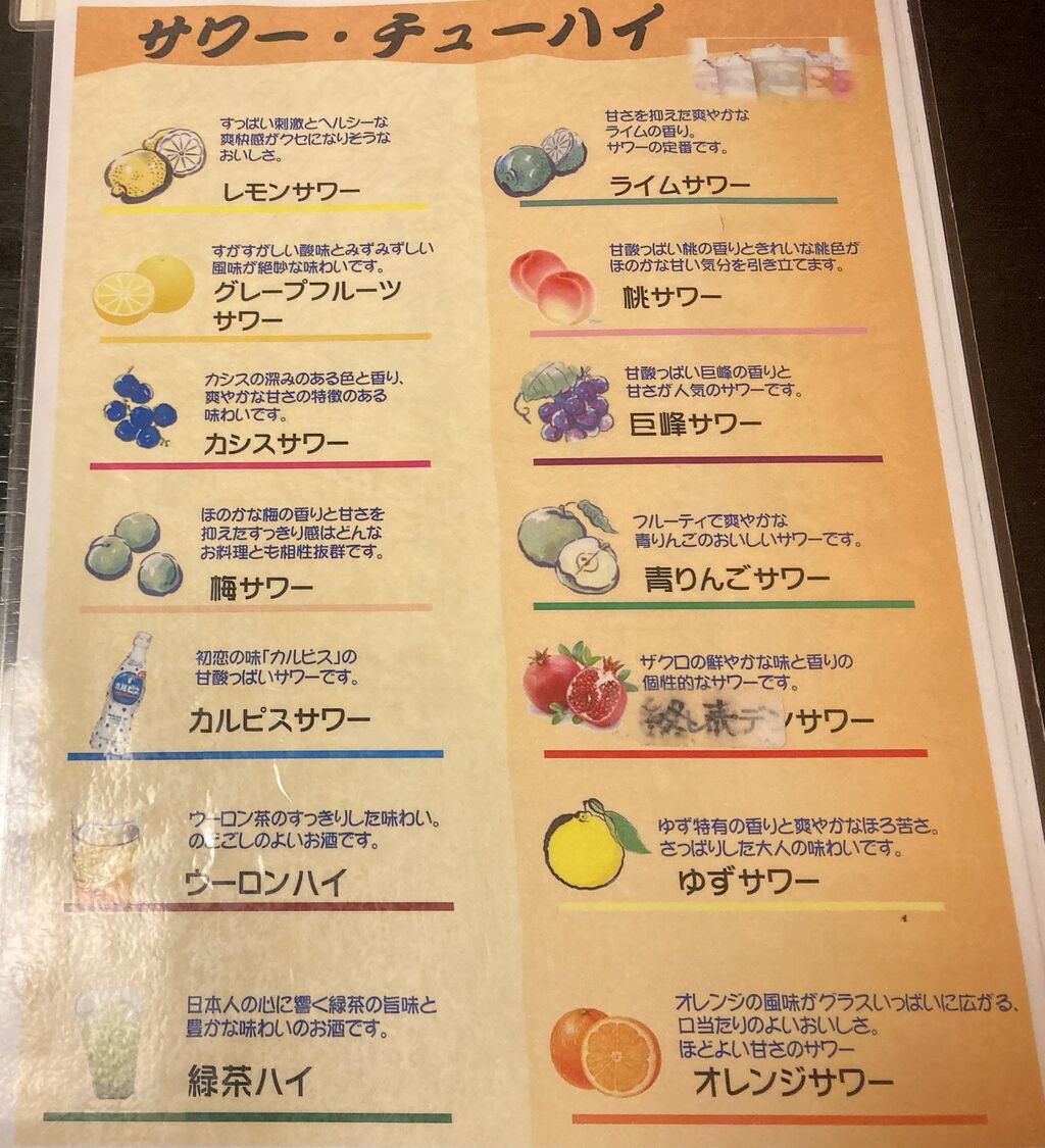 サワー、チューハイのメニュー。