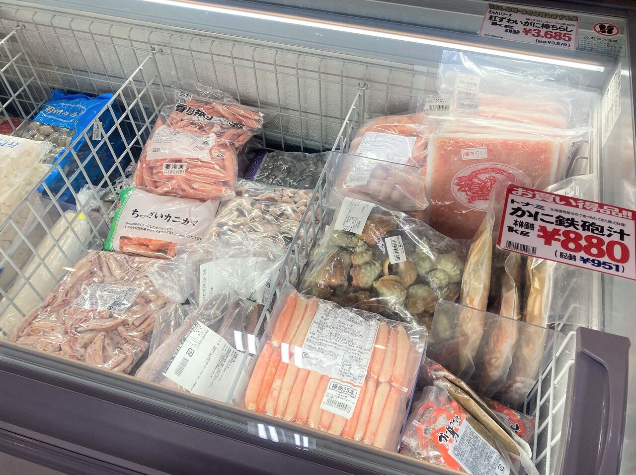 冷凍の海産物もたくさんあった。