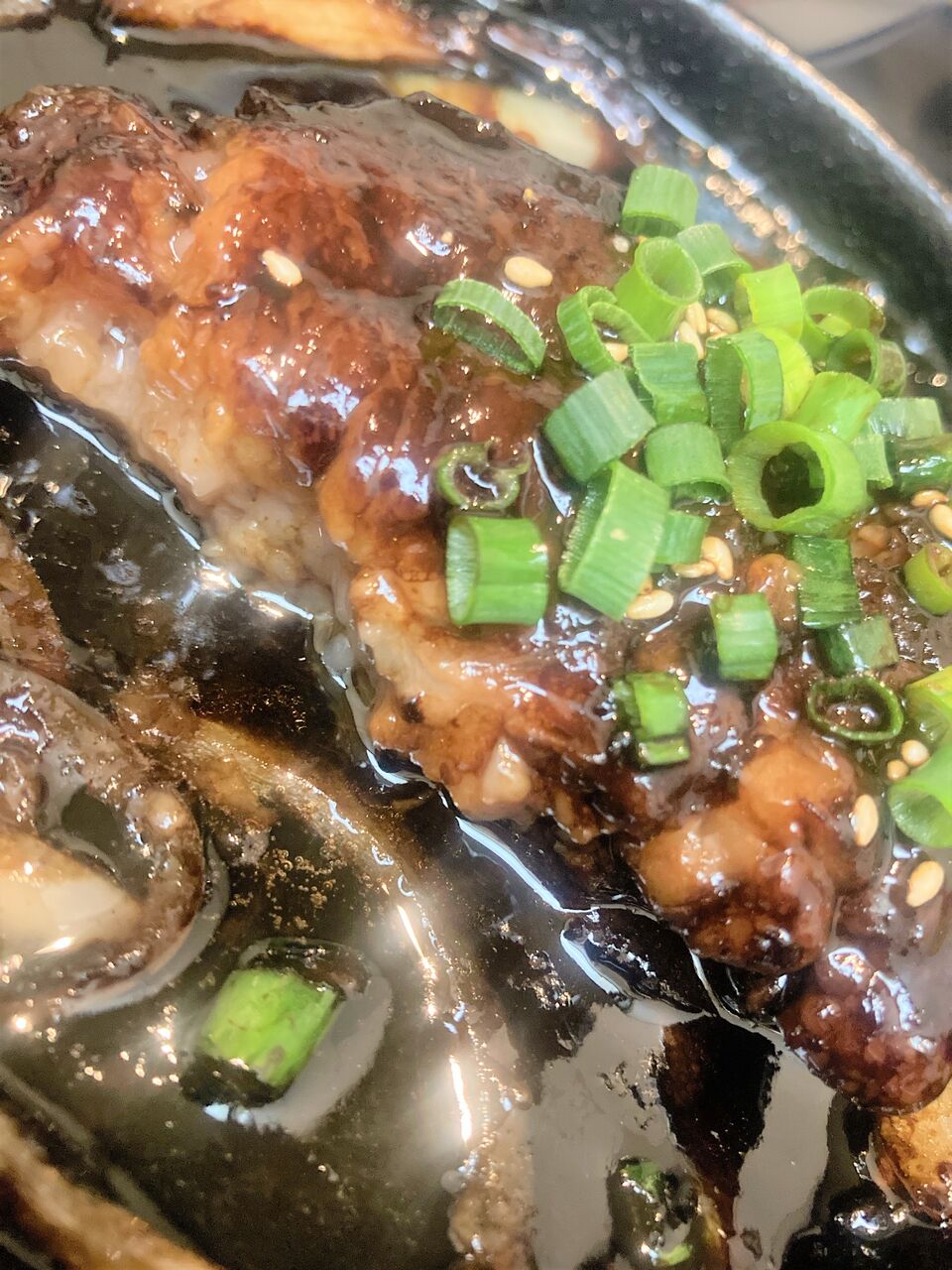 鉄板でグツグツいってて、美味そうだ。